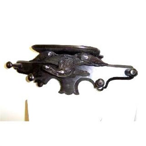 A very unusual ebonized oak wall hung shelf/hat rack with a carved eagle and turned hooks.