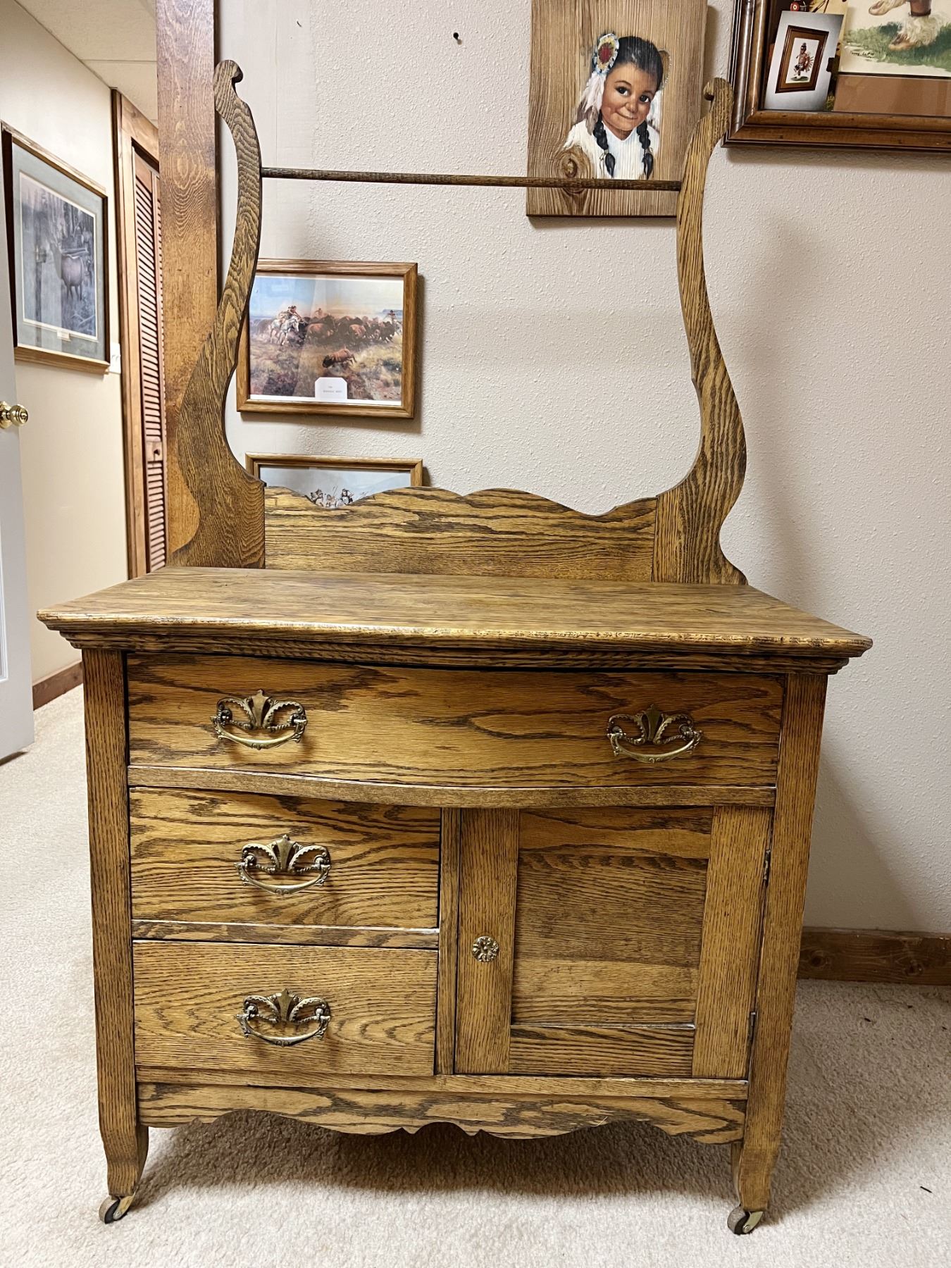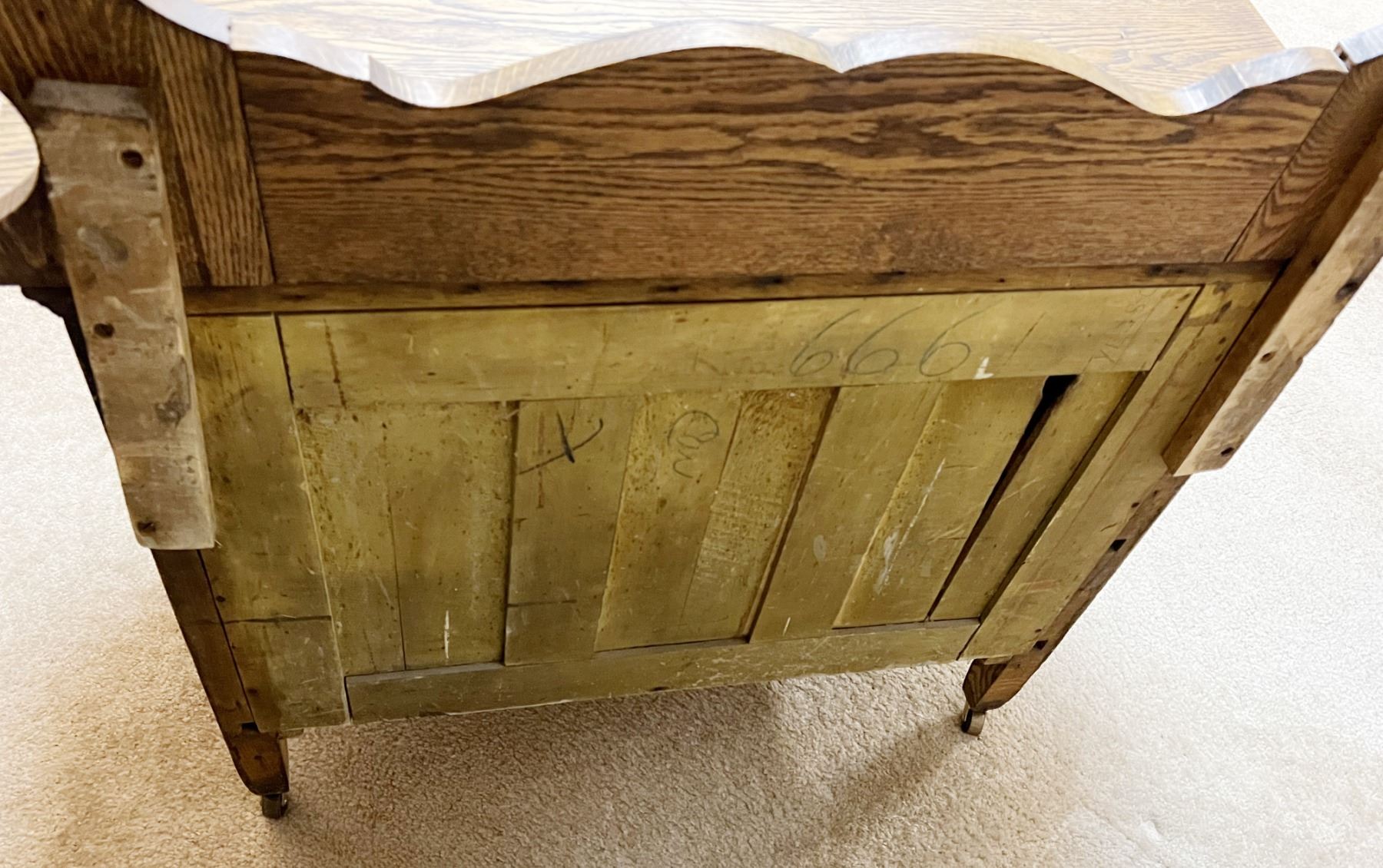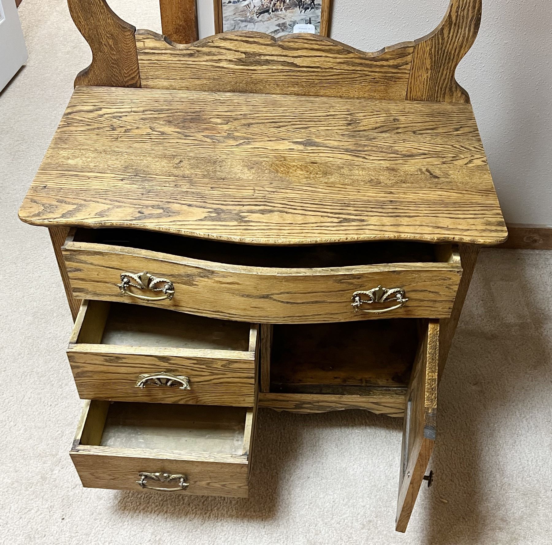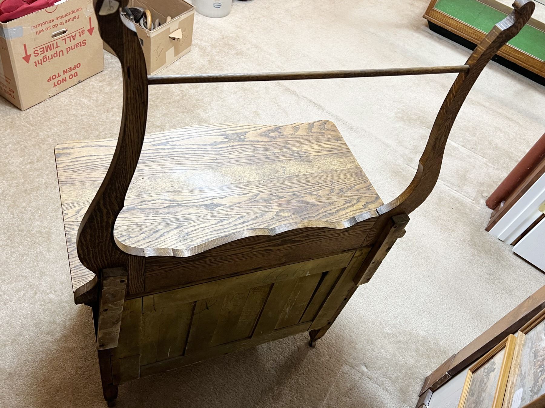 Oak wash stand with towel bar, serpentine front, original hardware, 28" h x 33" w