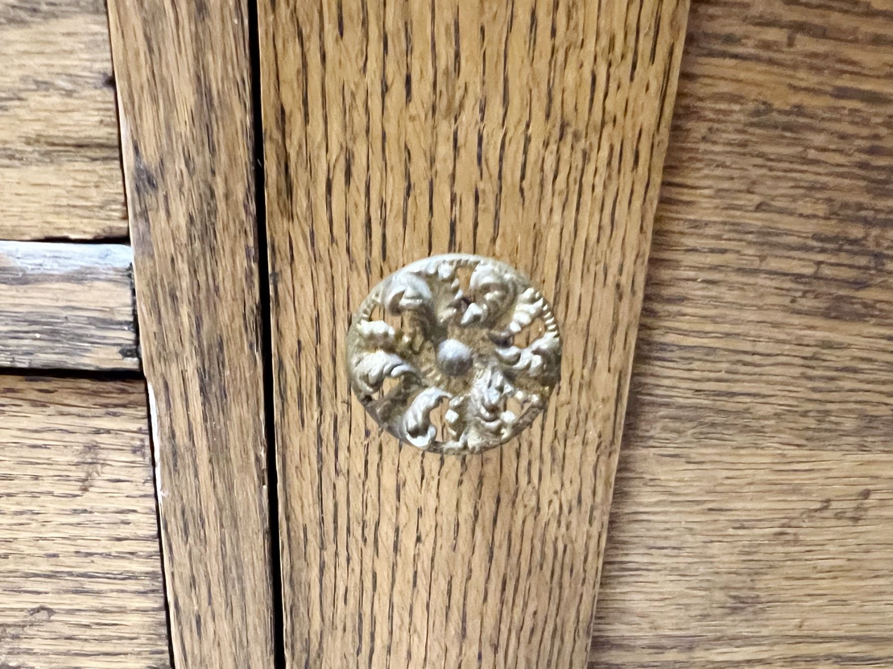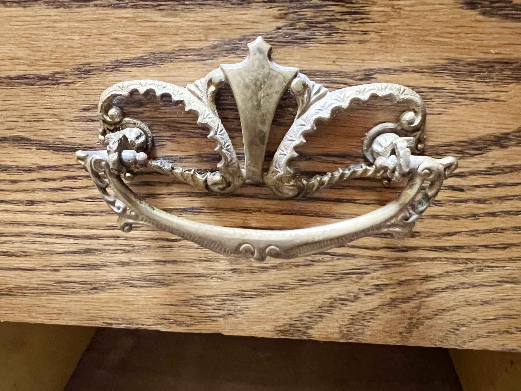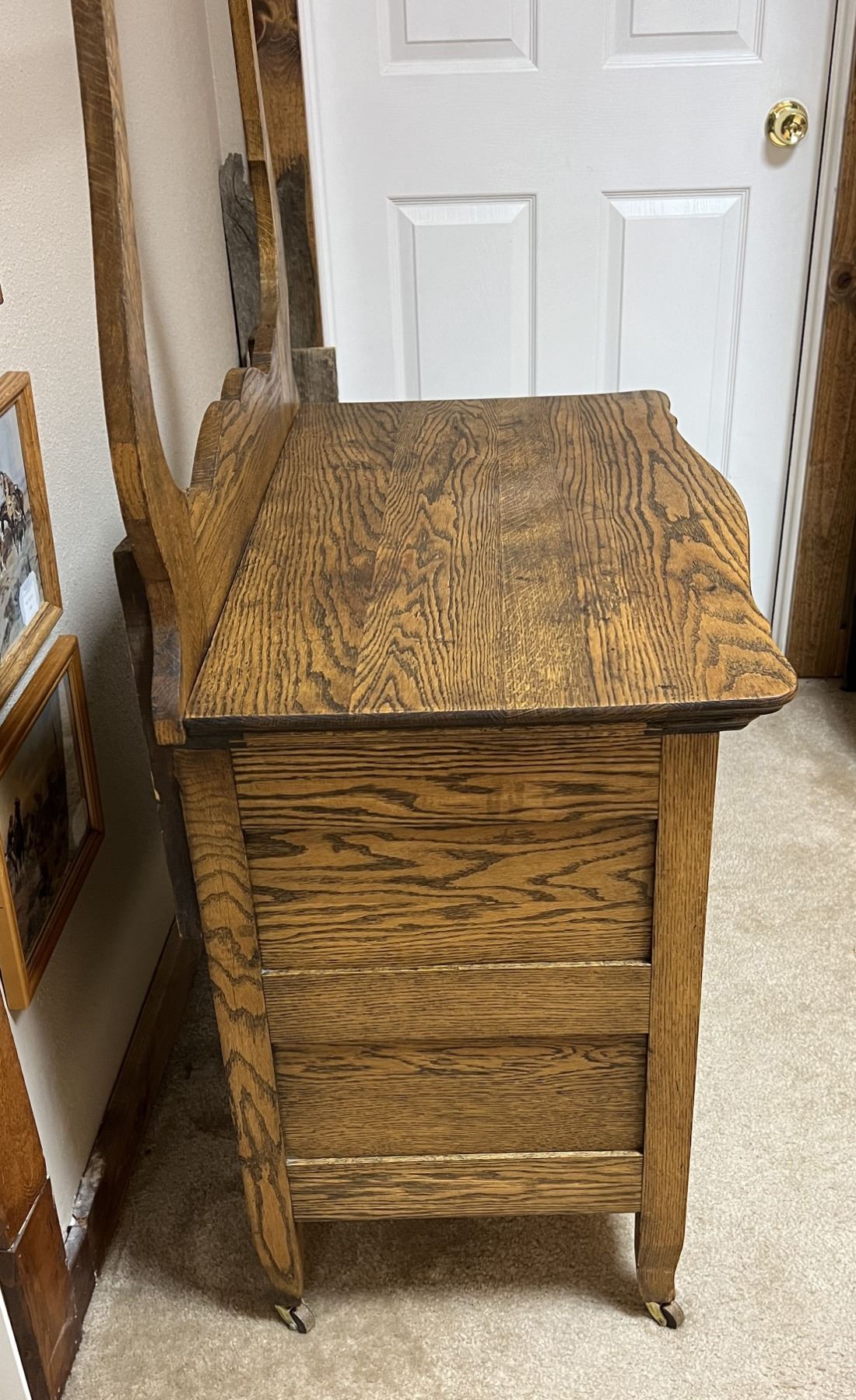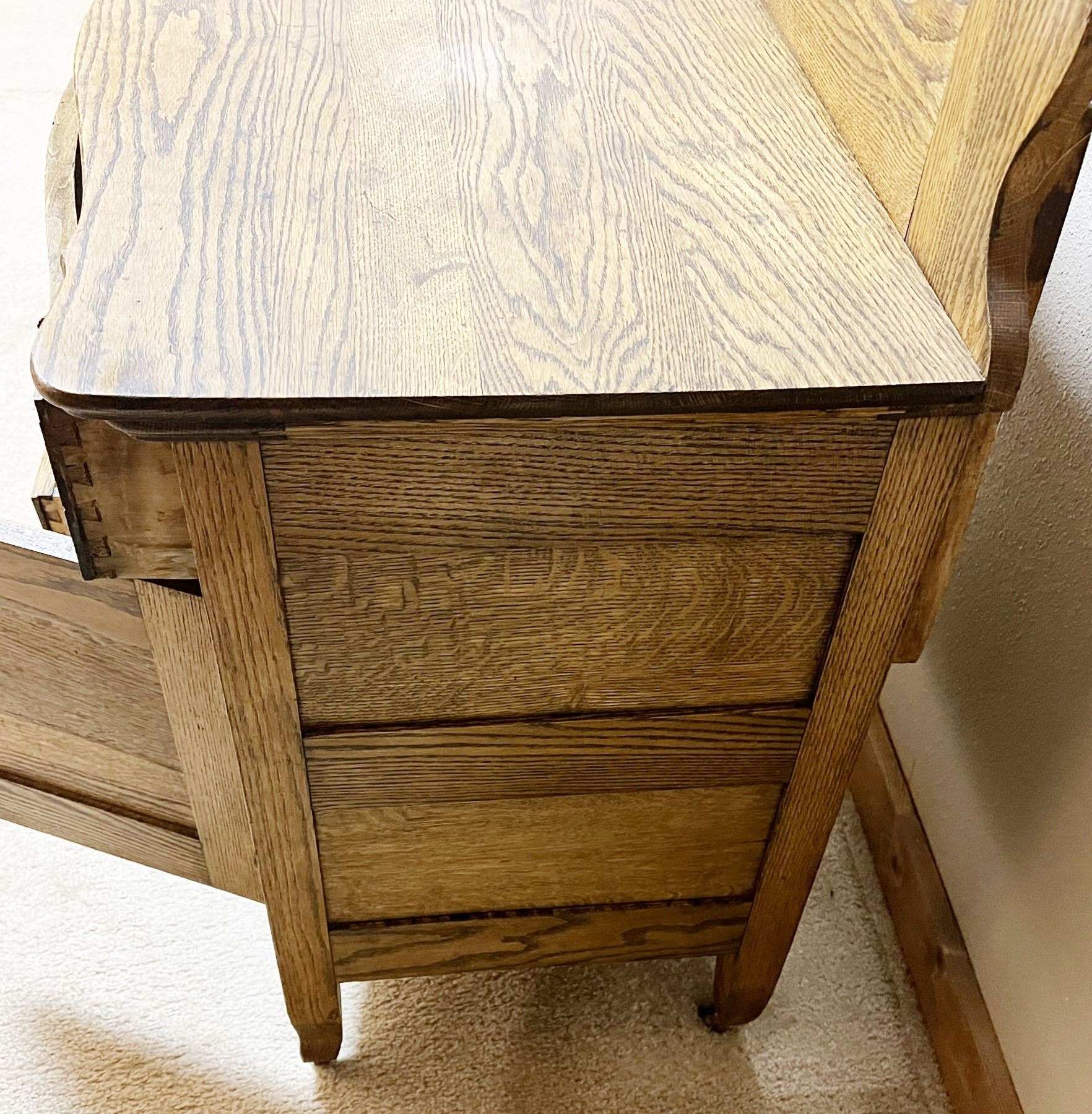 Oak wash stand with towel bar, serpentine front, original hardware, 28" h x 33" w