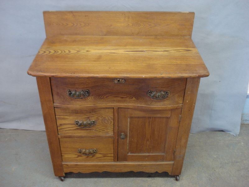 Oak washstand with backsplash, large single drawer over single door and two small drawers.