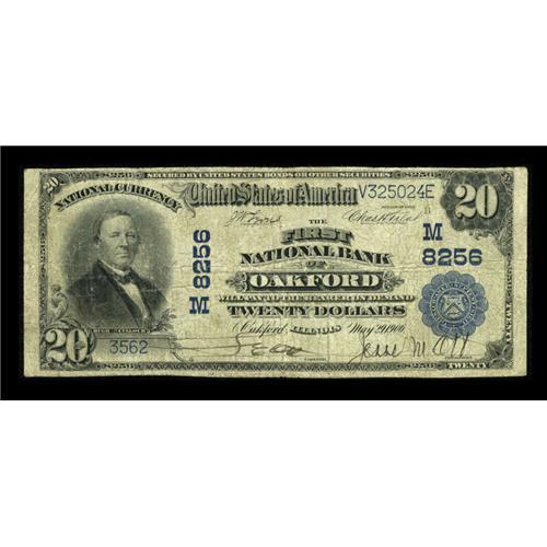 <B>Oakford, IL</B></I> - $20 1902 Plain Back Fr. 651 <B>The First NB</B></I> Ch. # (M)8256<BR>Nice pen signatures grace this elusive issue that is a touch on the softer side. <B>Very Good-Fine.</B></I><BR><I>From The Lincoln Collection</B></I><BR><BR><b>Shipping:</b> Coins & Currency (<a target="_blank" href="http://www.heritageauctions.com/common/shipping.php">view shipping information</a>)