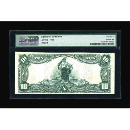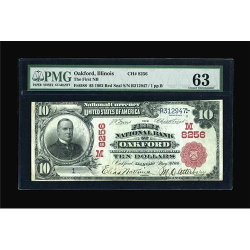 <B>Oakford, IL</B></I> - $10 1902 Red Seal Fr. 614 <B>The First NB</B></I> Ch. # (M)8256<BR> This attractive Serial Number One Red Seal is from a known 10-10-10-20 cut sheet. Interestingly this plate position B note was the only piece to survive without sheets folds or handling and remains the only note from the sheet in fully uncirculated condition. Though the top margin is cut tight, the bright overprint and carefully penned officers' signatures provide aesthetic appeal. <B>PMG Choice Uncirculated 63.</B></I><BR><BR><b>Shipping:</b> Coins & Currency (<a target="_blank" href="http://www.heritageauctions.com/common/shipping.php">view shipping information</a>)