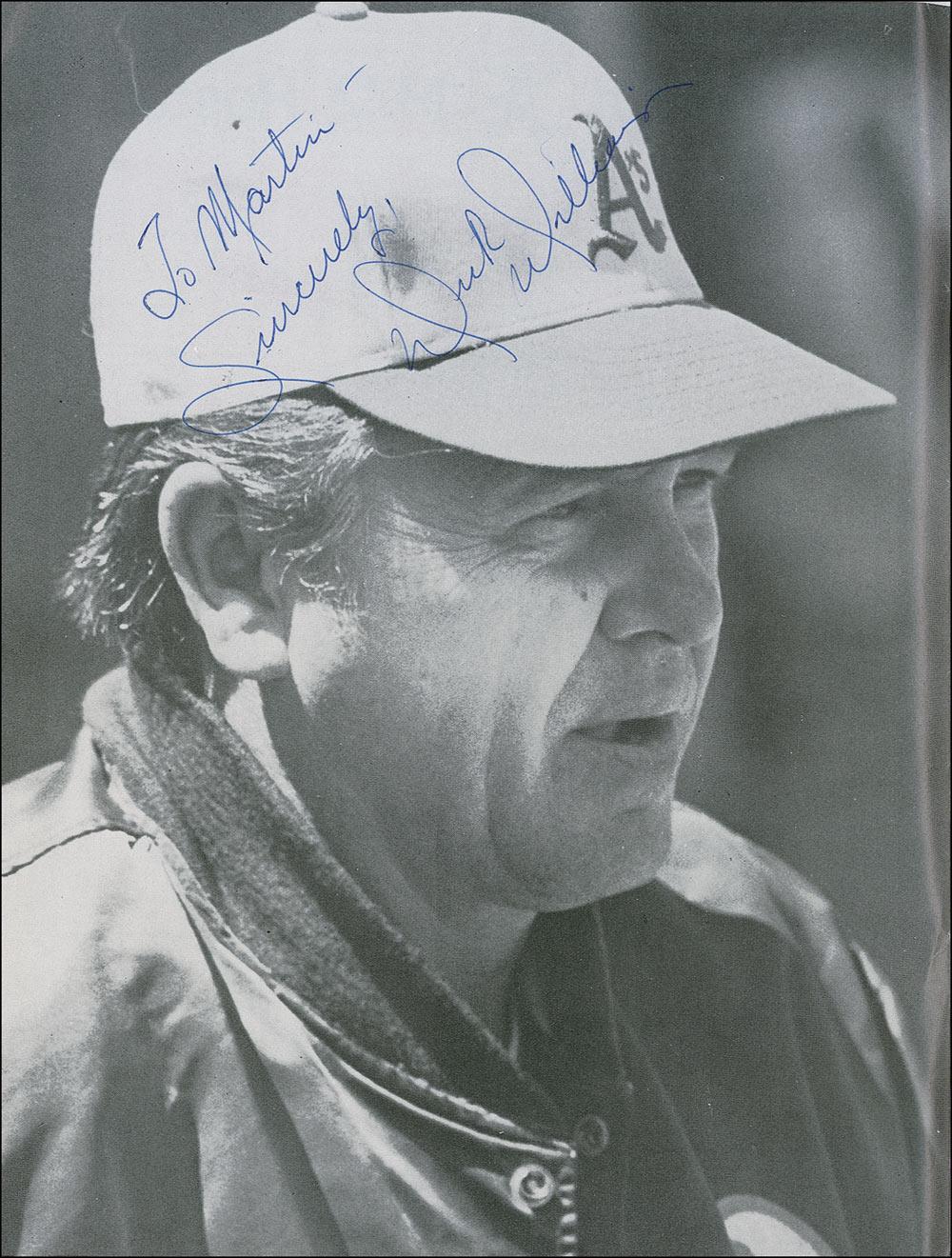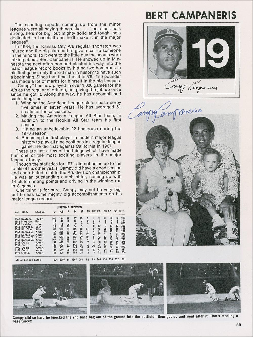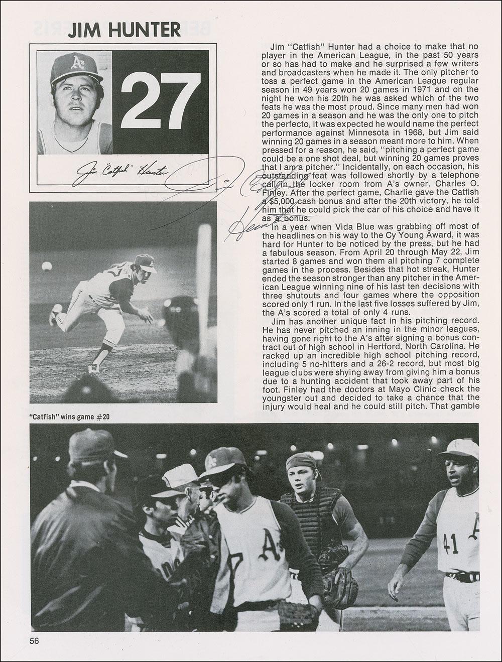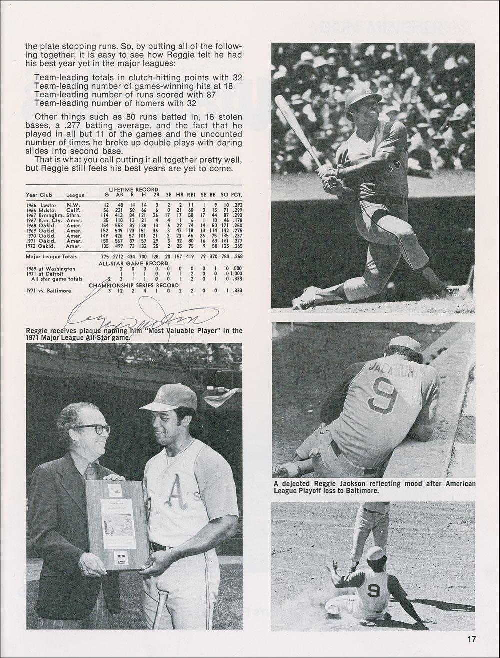 Official 1972 Oakland A’s World Series program, 8.5 x 11, signed inside in blue or black ink on or near their photos by Dick Williams, Sal Bando, Dal Maxvill, Reggie Jackson, John Odom, Ken Holtzman, Gonzalo Marquez, Ted Kubiak, Joe Rudi, Vida Blue, Mike Hegan, Gene Tenace, Bert Campaneris, Jim ‘Catfish’ Hunter, Dick Green, and Gonzalo Marquez (a rare autograph as he died in 1984 at the age of 38 in Venezuela). A few of the pages are inscribed. Also signed in black ballpoint on the front cover by Ray Fosse and Rich McKinney, who joined the team in 1973. In very good condition, with scattered creasing, handling wear, and scuffing.