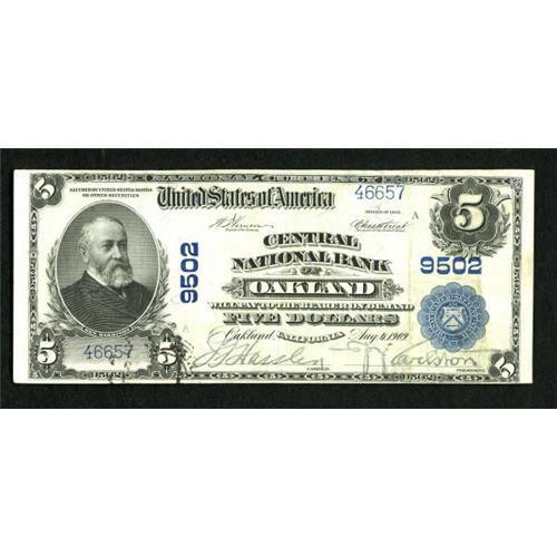 <B>Oakland, CA</B></I> - $5 1902 Plain Back Fr. 600 <B>Central NB</B></I> Ch. # 9502<BR> A bright representative from this Alameda County institution that has a partial stamp at left. Officers are J.F. Hassler and J.C. Carlston and their signatures remain strong. <BR><I>From The Walla Walla Collection</B></I><BR><BR><b>Shipping:</b> Coins & Currency (<a target="_blank" href="http://www.heritageauctions.com/common/shipping.php">view shipping information</a>)