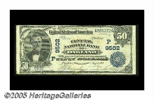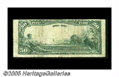<B>Oakland, CA</B></I> - $50 1902 Date Back Fr. 669 <B>Central NB</B></I> Ch. #(P)9502<BR><B>Very Fine,</B></I> but with a closed spindle hole at center and two small margin separations at bottom. We sold an EF-AU of this type from here in our September 2004 Long Beach Auction for $2,587.50. This note, with plenty of residual paper body still evident and strongly stamped officers' signatures remaining quite legible will sell for roughly...