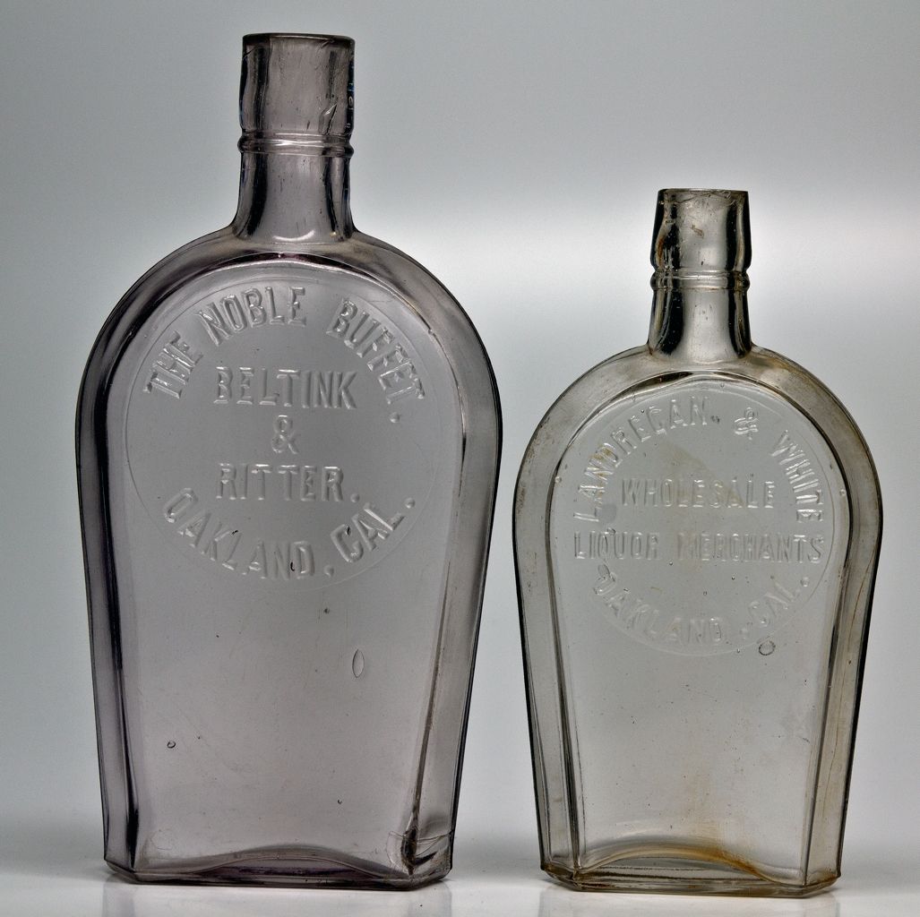 Lot of 2: 1) Slug marked THE NOBLE BUFFET BELTINK & RITTER OAKLAND, CAL. on this one pint clear glass bottle. Top is neatly applied, single collar, un-ground. There are air vent holes on shoulders and some small bubbles. This is a post-1906 earthquake sample. Gus J. Beltink opened the Noble Bar on 14th St. In 1904. In 1906, he formed a partnership with George P. Ritter that lasted 10 years [Ref: Picnics, Coffins, Shoo-Flies, Thomas, 1974]. 2) Slug inscribed LANDREGAN & WHITE WHOLESALE LIQUOR MERCHANTS OAKLAND, CAL. on this half pint, clear glass coffin, with single collar, neatly applied, un-ground top. James Landregan went into partnership with a Mr. White in 1907. The business was on 61st St. and closed in 1920 because of Prohibition [Ref: Picnics, Coffins, Shoo-Flies, Thomas, 1974]. - Feisel Collection -59273