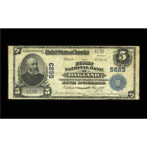 <B>Oakland, MD</B></I> - $5 1902 Plain Back Fr. 607 <B>The First NB</B></I> Ch. # 5623<BR>A decent Blue Seal from this scarce western Maryland bank. <B>Fine.</B></I>