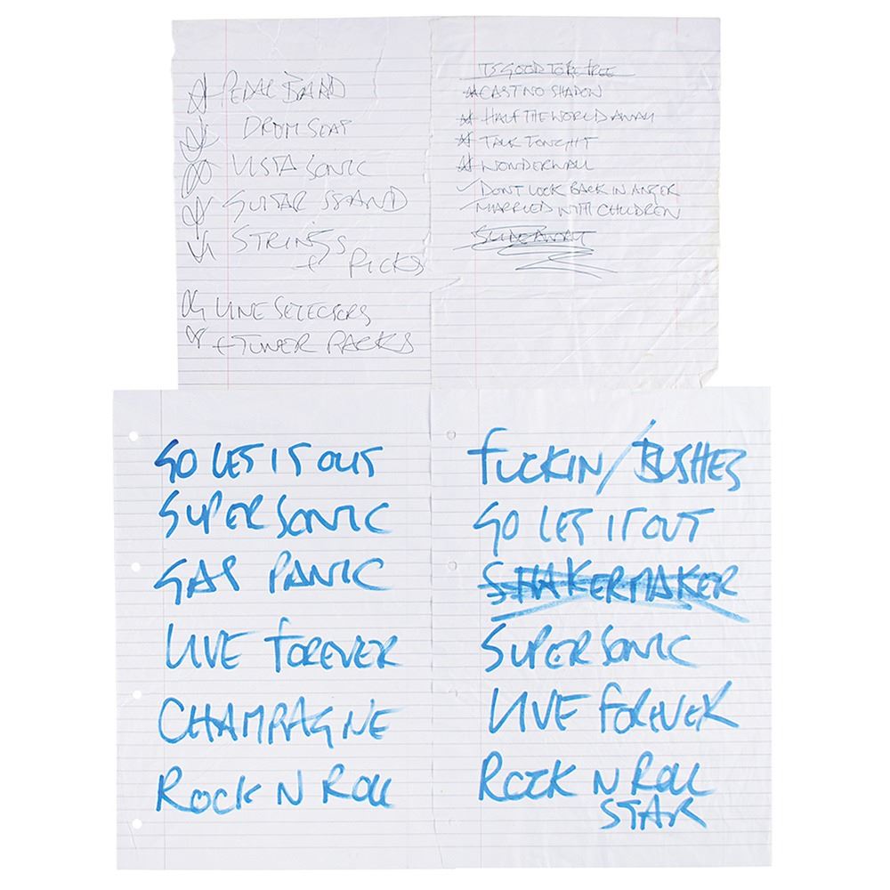 Set of four sheets containing song titles and equipment requirements written in the hand of Oasis songwriter Noel Gallagher, presumably done as lists or guides for concert sound checks. The sheets range in size from 7 x 9 to 8.25 x 11.75, and are written in blue felt tip and black ballpoint, with the two larger song sheets reading: “Go Let It Out, Supersonic, Gas Panic, Live Forever, Champagne, Rock N Roll†and “Fuckin/Bushes, Go Let It Out, [Shakermaker] Supersonic, Live Forever, Rock N Roll Star.†The smaller song sheet: “It’s Good to Be Free, Cast No Shadow, Half the World Away, Talk Tonight, Wonderwall, Don’t Look Back in Anger, Married with Children [Slide Away].†The gear list: “Pedal Board, Drum Seat, Vista Sonic, Guitar Stand, Strings + Picks, Line Selectors + Tuner Racks.†In overall very good to fine condition, with overall creasing, and a tear to top edge of gear list.