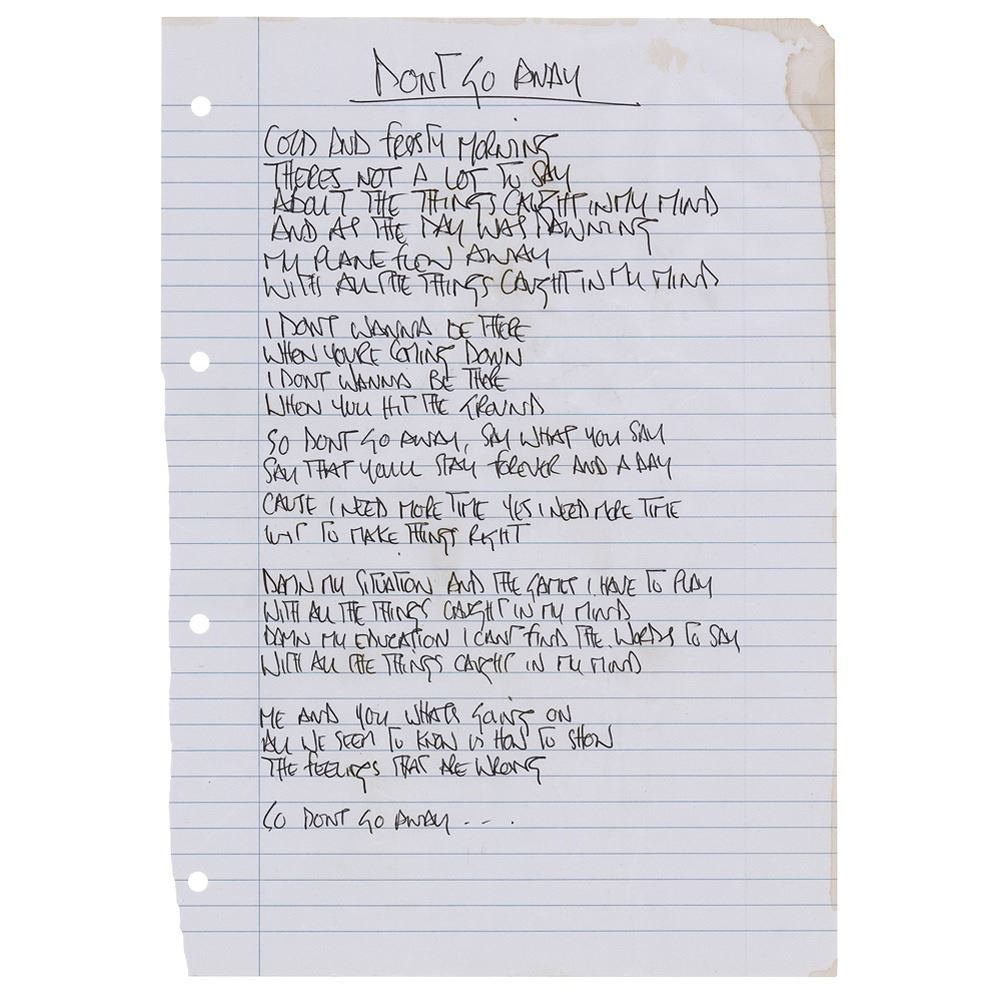 Unsigned handwritten lyrics by Noel Gallagher for "Don't Go Away," one page, 8 x 11.75, beginning: "Cold and frosty morning / There's not a lot to say / About the things caught in my mind / And as the day was dawning / my plane flew away / with all the things caught in my mind." He goes on to write out the chorus: "So don't go away, say what you say / Say that you'll stay, forever and a day / Cause I need more time, yes I need more time / Just to make things right.". In fine condition, with light overall creasing, and light staining, heaviest to the upper right corner. A popular song from Oasis' third studio album Be Here Now, 'Don't Go Away' peaked at number 35 on the US Billboard Hot 100 Airplay chart.