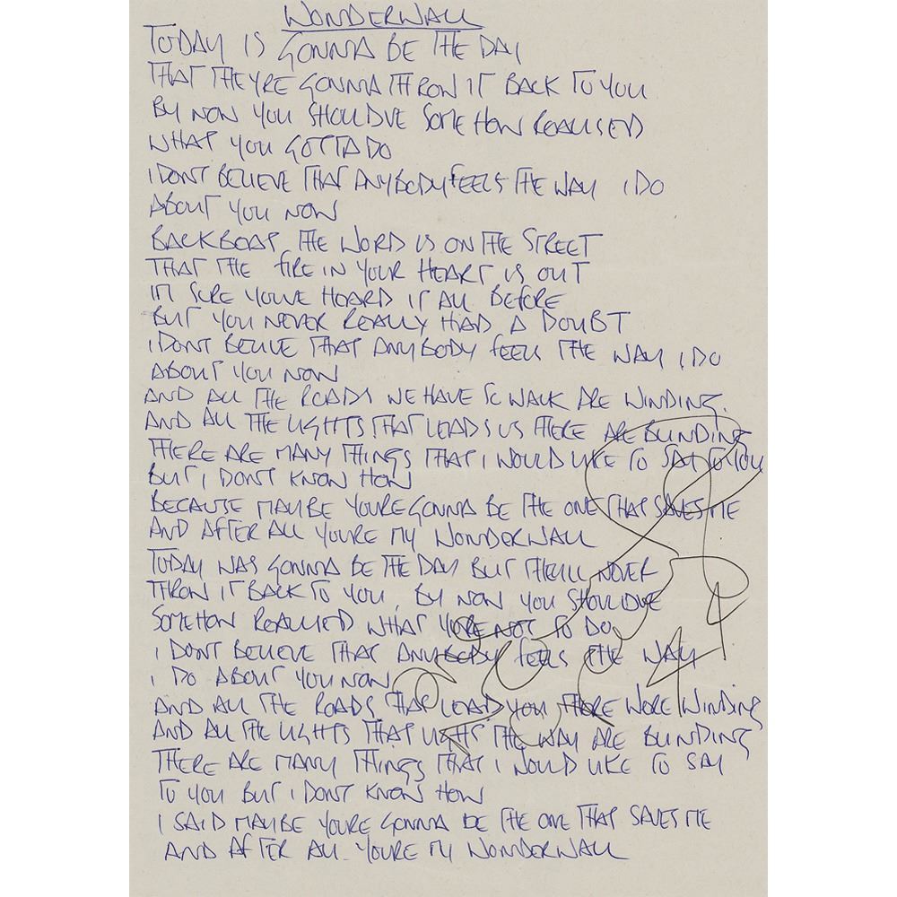 Handwritten lyrics by Noel Gallagher for "Wonderwall," one page, 8.25 x 11.75, signed at the conclusion in black ballpoint, "Love, Noel Gallagher, xx." Gallagher pens the lyrics to Oasis' most popular song, beginning: "Today is gonna be the day / that they're gonna throw it back to you / By now you should've some how realised / what you gotta do / I don't believe that anybody feels the way I do / about you now." The piece closes with the famous chorus: "I said maybe you're gonna be the one that saves me / And after all you're my wonderwall." In fine condition, with light overall creasing. A spectacular example of the band's most iconic song, written in full and signed by the songwriter.