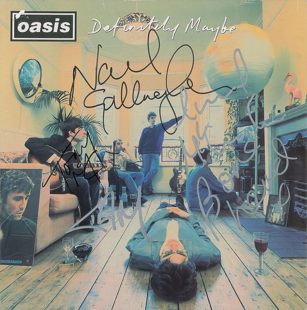 Definitely Maybe album flat signed on the front cover in black felt tip by Noel Gallagher and Tony McCarroll, and in silver ink by Paul 'Bonehead' Arthurs, Paul McGuigan, and Liam Gallagher. In fine condition, with a staple to right side and various punctures from removed staples, including a small hole to upper left corner.