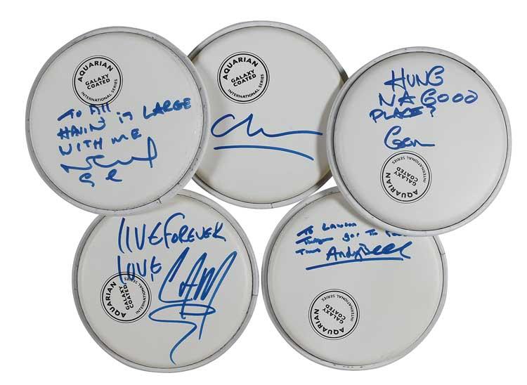 Five unused galaxy-coated 6” drumheads, each signed in blue felt tip by a member of Oasis: Liam [Gallagher], Noel [Gallagher], Andy Bell, Gem [Archer], and Chris Sharrock. In very fine condition. RRAuction COA.