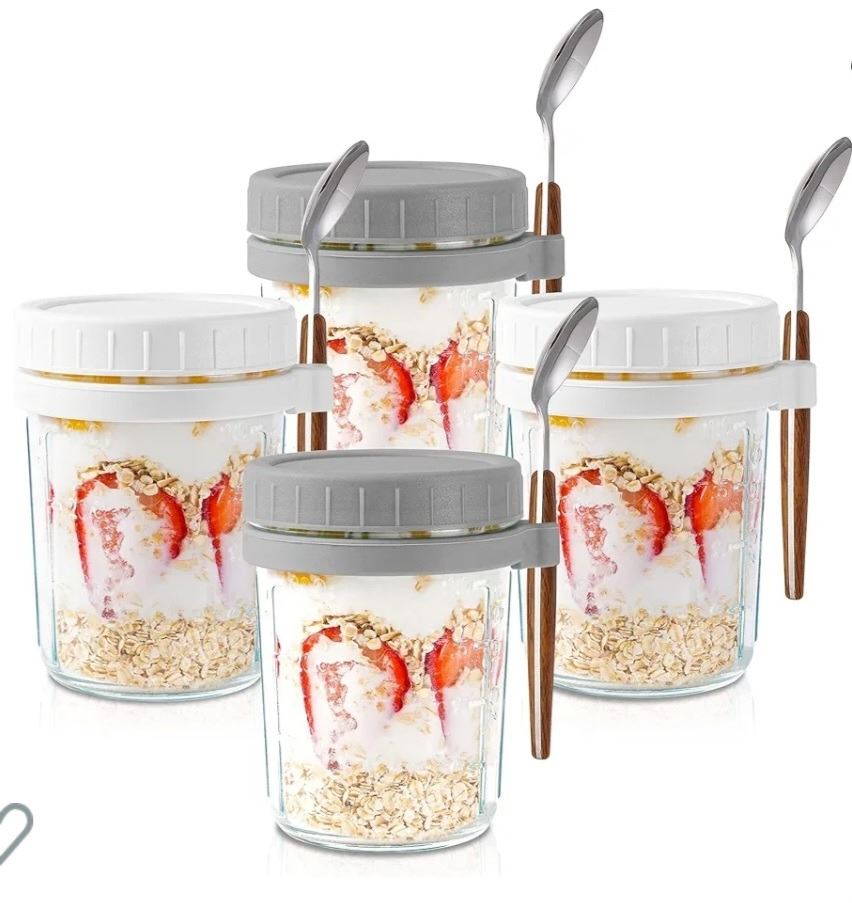 Set of four overnight glass oatmeal containers, with lids and spoons, 2 sizes big and small, items not identical to picture lids all grey 2 are bigger then the ones in the picture, new