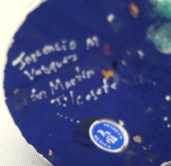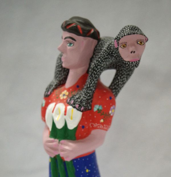 Oaxacan Alebrije Rare Figure of Frida Kahlo. Hand carved and painted by Inocencio Vasquez of San Martin Tilcajete, Oaxaca, Mexico and signed by the artist. With a Monkey riding her shoulders, it stands approx. 9'' tall and is 5'' wide. Diego Rivera and Frida Kahlo Collected the first Alebrije created by famous Mexican artist Pedro Linares.