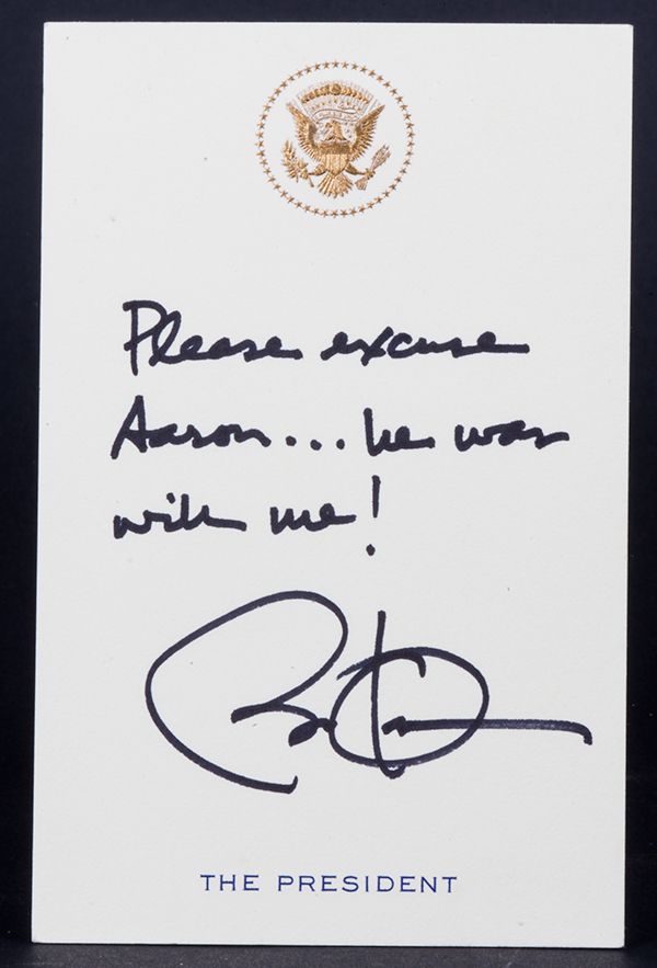 Obama, Barack (1961 -) 44th and current President of the United States (2009-present). Autograph note signed as President, on 3½ x 5½ in. note card with embossed gilt Presidential Seal at top and "The President" engraved at the bottom. The President writes, "Please excuse Aaron…he was with me! Barack Obama."