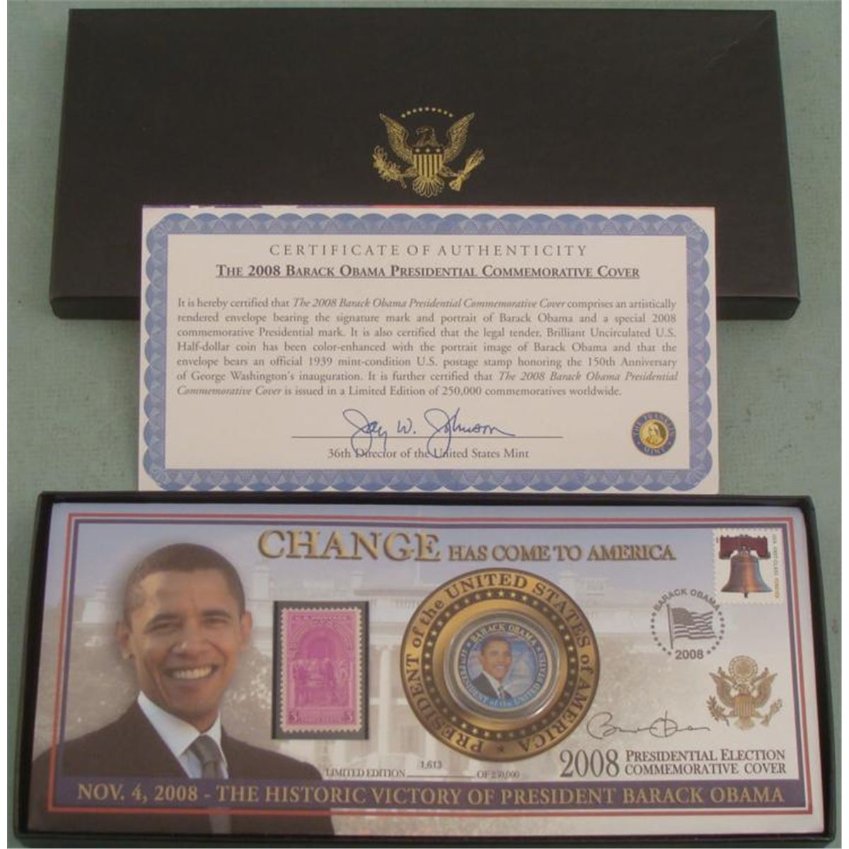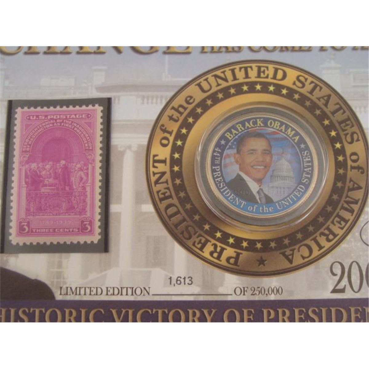 Obama Change Has Come to America Commemorative Coin and Stamp Set * Included:1 Coin layered in 24 K Gold and colorized with portrait image of Barack Obama3 cent 1939 Washington stampEdition: Limited 1,613 of 250,000Condition: Brilliant Uncirculated, on stamped envelope display, with Certificate of Authenticity