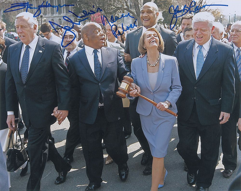 Famous color glossy 10 x 8 photo of congressional Democrats walking into the Capitol to vote on the ‘Obamacare’ bill, signed in blue felt tip by Nancy Pelosi (Speaker of the House), Steny Hoyer (Majority Leader), John Lewis, and John Larson (Chair of the House Democratic Caucus). In very fine condition.
