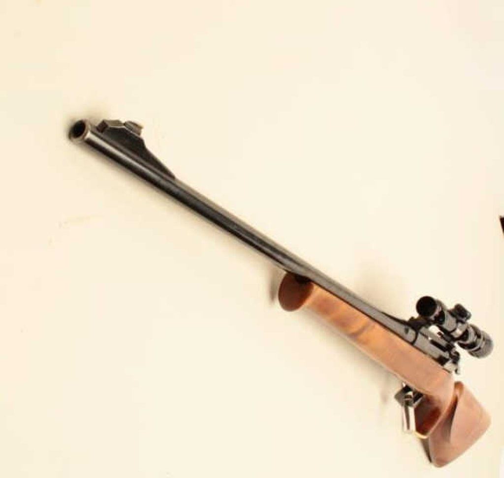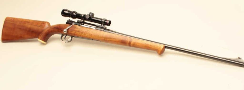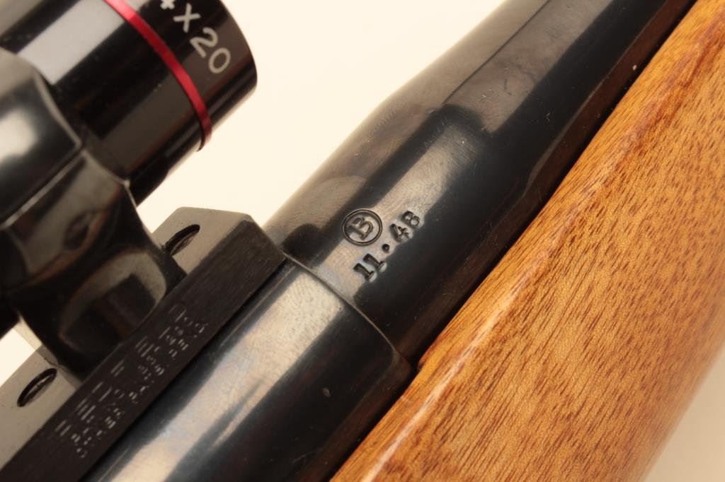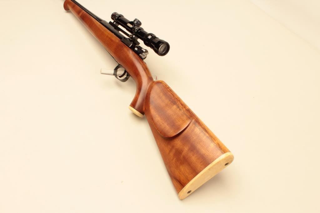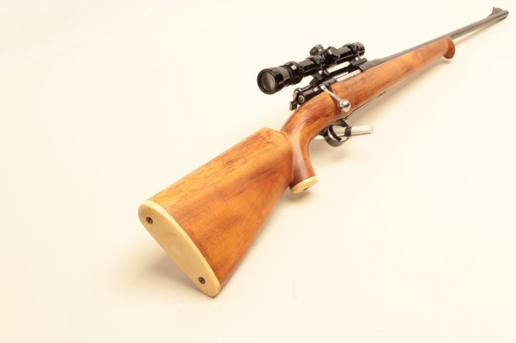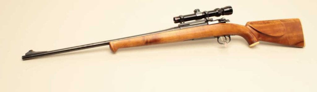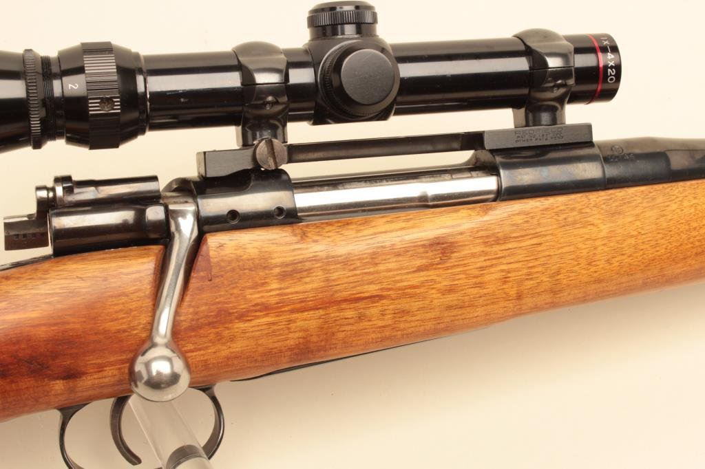 .300 Savage caliber, Serial #E 3097. The rifle is in good overall condition with a 23” barrel with a ramp blade front sight. The barrel and receiver retain the majority of an old quality re-blue with light wear at the muzzle. The barrel is dated 11-48 and marked 0.3 SVG, while the bolt handle has been chromed and bent to accommodate scope mounting. The smooth wood custom stock is in very good condition with a Schnabel fore end, faux ivory grip cap and butt plate. The rifle is topped with a Redfield one-piece Redfield mount and Simmons 1 x 4 x 20 variable power scope. Est.: $200-$400. (C+R).