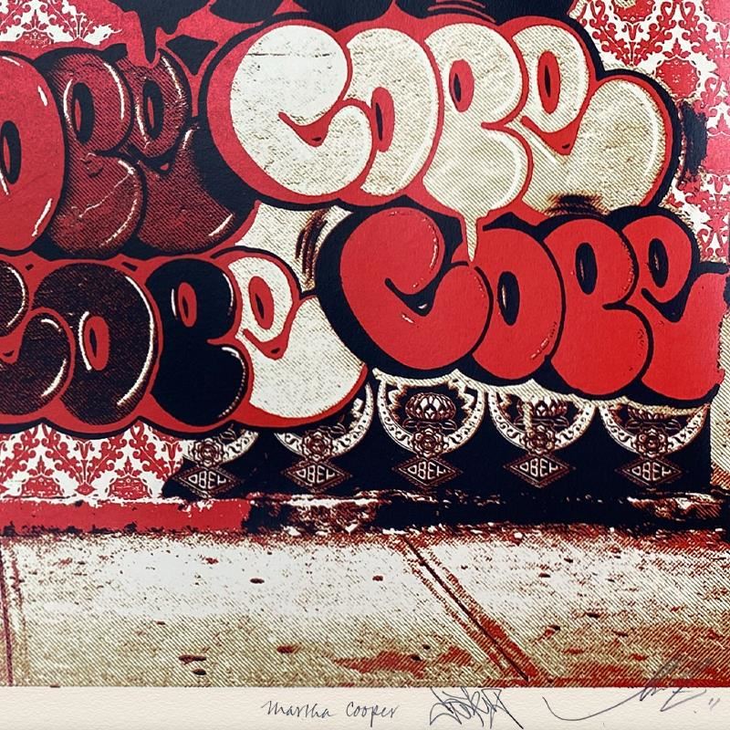 "Obey X COPE2 X Cooper" is a limited edition screen print on paper by Shepard Fairey. This piece is numbered 53/450, and hand signed by Fairey, COPE2, and Martha Cooper (the photographer who shot the reference photo for this illustration. Includes Letter of Authenticity. Measures approx. 18" x 24" (image).