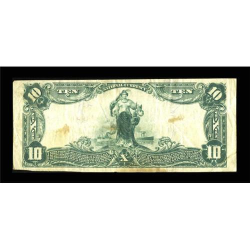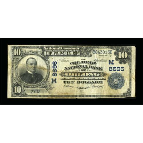 <B>Oblong, IL</B></I> - $10 1902 Plain Back Fr. 626 <B>The Oil Belt NB</B></I> Ch. # (M)8696<BR> Only about a half dozen large size notes are known from this Crawford County issuer. This piece shows a very deep blue overprint though there is a stain that affects the bottom half of the note. <B>Very Fine.</B></I><BR><BR><b>Shipping:</b> Coins & Currency (<a target="_blank" href="http://www.heritageauctions.com/common/shipping.php">view shipping information</a>)