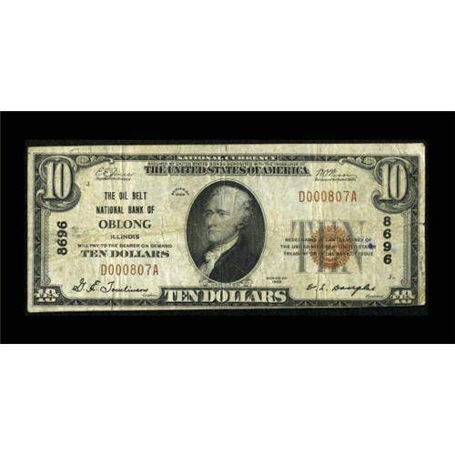 <B>Oblong, IL</B></I> - $10 1929 Ty. 1 <B>The Oil Belt NB</B></I> Ch. # 8696<BR> An attractive and problem free example of this popularly titled bank. This Crawford institution opened in 1907 and was liquidated in 1931. G.E. Tomlinson and E.L. Douglas signed this issue. <B>Fine.</B></I><BR><BR><b>Shipping:</b> Coins & Currency (<a target="_blank" href="http://www.heritageauctions.com/common/shipping.php">view shipping information</a>)