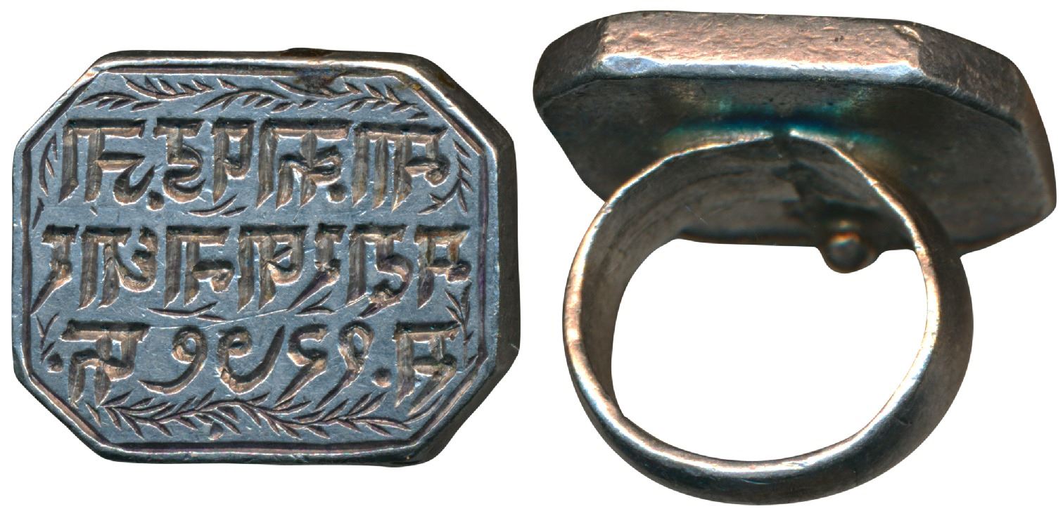 Oblong Octagonal Silver Signet Ring, 20.81g, with inscription in three lines maa kapad ja / madarkhana dhar / sa 1279 fa . ??I ????. ?? / ???????? ??? / ? ???? ?. “??I” is a short-form for ‘Muhakama’, meaning ‘department’ or ‘division’. The seal is thus of ‘Cloth department’ of the royal vestiary of Dhar state. The date given is Fasli Era 1279 = 1871/1872 AD. It therefore corresponds to Raja Anand Rao III Pawar’s 2nd reign, 1860-1898AD. Extremely Fine, Rare.