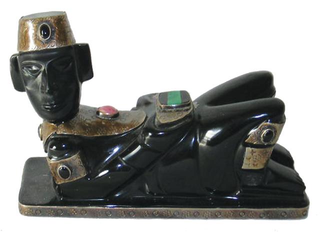 Circa 1950s, Toltec Chac Mol obsidian sculpture with semi-precious stones. 4-1/2" x 6-1/2" x 2-1/2"