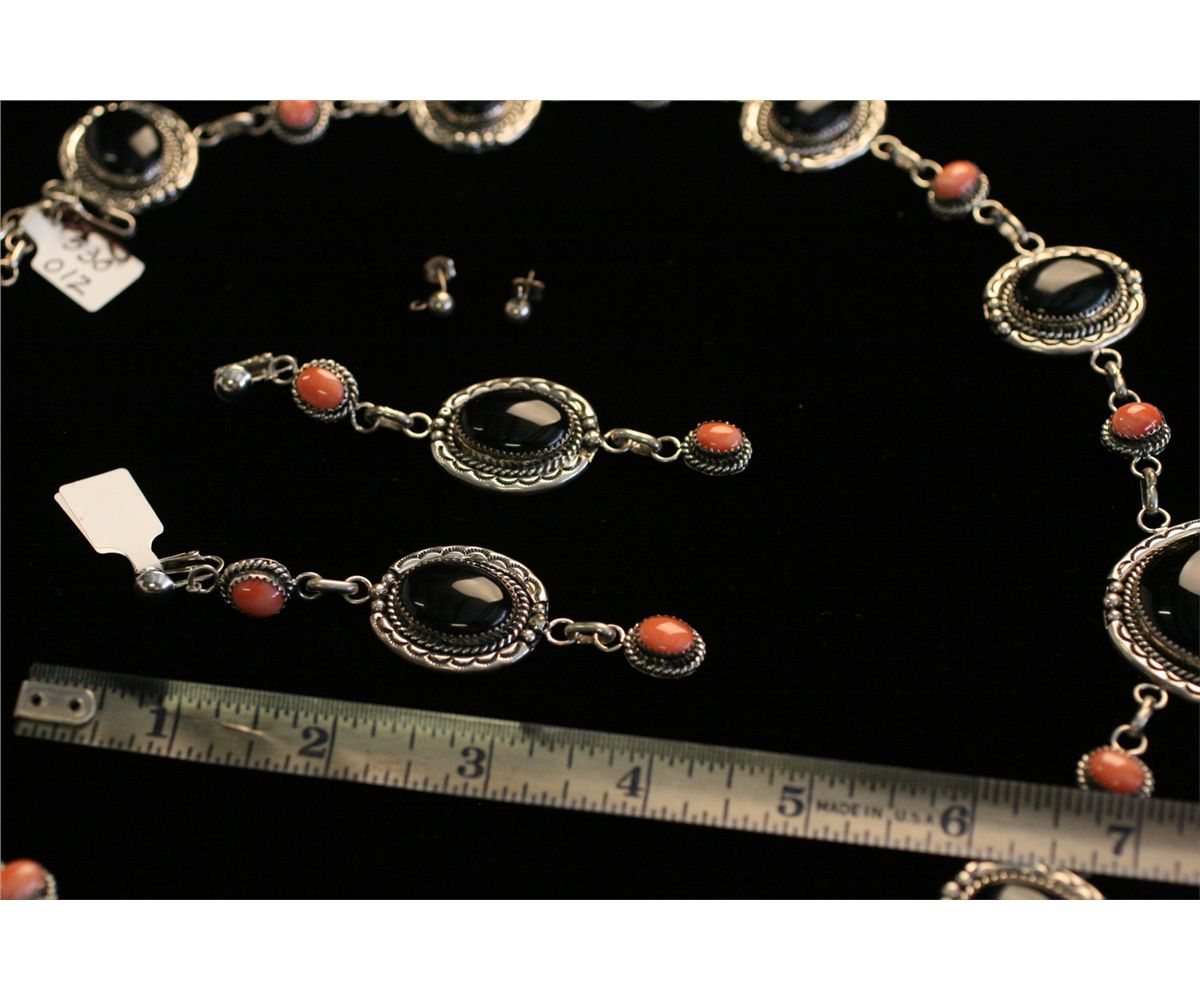 Necklace and Matching Earrings, Obsidian and coral cabochons with silver mountings with matching earrings, By "Benally", Necklace is 30" Long earrings 3-1/2" Long, Sterling, -530012-
