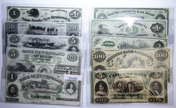 Obsolete Bank and Railroad Remainder Notes, Uncirculated, 10 pieces. Bank of New England, East Haddam, CT 1 and 5, City Bank of New Haven, CT 5 and 20, State Bank of New Brunswick, NJ 1, Citizens Bank of Louisiana, New Orleans 5 & 100, State of South Carolina 2, South Carolina Rail Road Company 1 and 5.