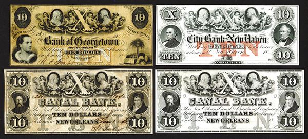Lot of 4 obsolete banknotes, Includes $10, City Bank of New Haven, Remainder; 2 examples of $10 Canal Bank, one partially issued; and 1856, $10, Bank of Georgetown, South Carolina, Issued, Black on light orange, issued, VF. Attractive group of notes. The Washington and Franklin vignettes are similar to the ones used on the first issue of U.S. Stamps. (4). TCC.