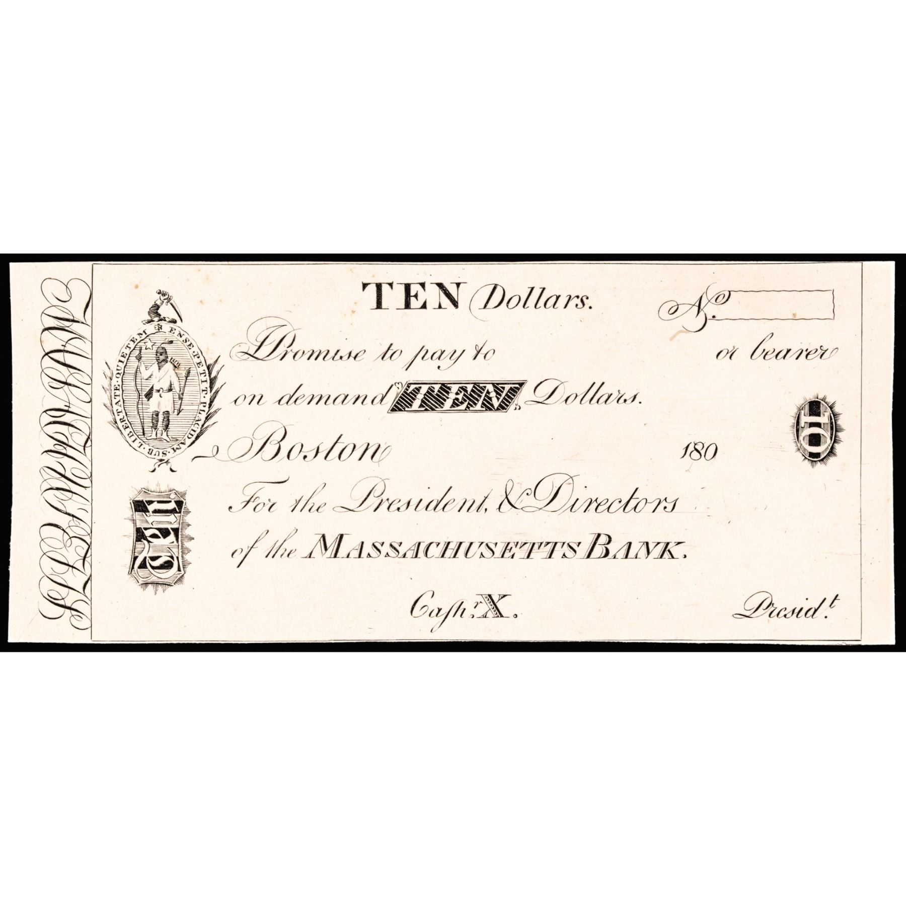 The Massachusetts Bank. Boston, Massachusetts. Ten Dollars. Historic 1800s Type. Original Plate Later Impression. Mounted on Cardstock. PCGS graded New-62.