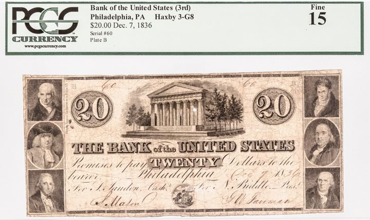 Haxby US-3 C8. Unlisted. Dated December 7, 1836. Imprint of Draper, Toppan, Longacre & Co. Three portraits at the left are; David Rittenhouse, William Penn, and Thomas Paine and the portraits at the right are; Robert Fulton, Benjamin Franklin and Robert Morris. At the center is a superb vignette of the Bank's building. This with the text reading: "For Jaudon” and “For Biddle". Choice centering, fully intact and evenly circulated with Low serial number 60. Rare & Unlisted 3rd Bank of the United States Twenty Dollar Note.