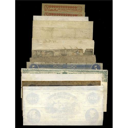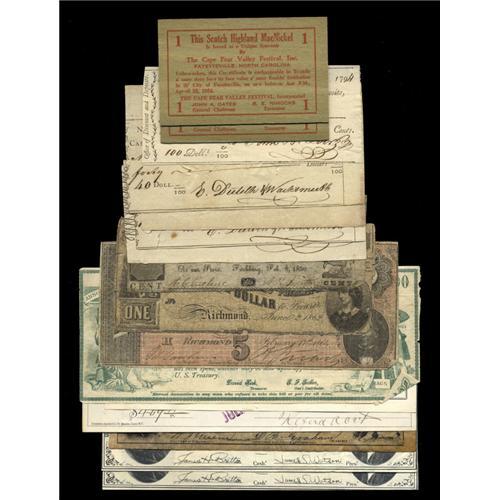 <B>Obsolete Miscellany including</B></I> Fitchburg 1¢ 1850 scrip; Confederate T44 $1; Confederate T69; Satirical 1880 "Absolute Money" $1000; two Scotch Highland of Fayetteville, NC 1954 Wooden "MacNickels;" five Philadelphia and Baltimore checks dated between 1792-95; an 1875 check; an 1879 check; reproduction State of Alabama $100 Jan. 1, 1864 note; and two reproduction Southern Bank of St. Louis $500 1859 notes. Grades range from <B>Good to Very Fine.</B></I> <I>Inspection is advised, as there will be no returns on this lot for any reason.</B></I>