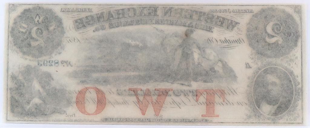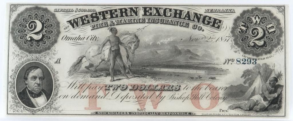 Obsolete Note: 1857 $2 Nebraska Territory - Western Exchange Fire and Marine Insurance Co - NE80.
