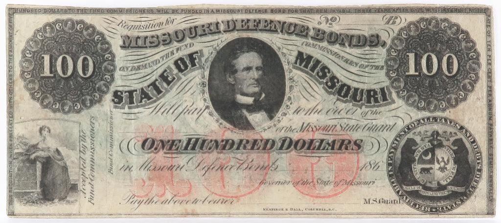 Obsolete Note: 1860's $100 State of Missouri - Confederate Defense Bond - CR19.