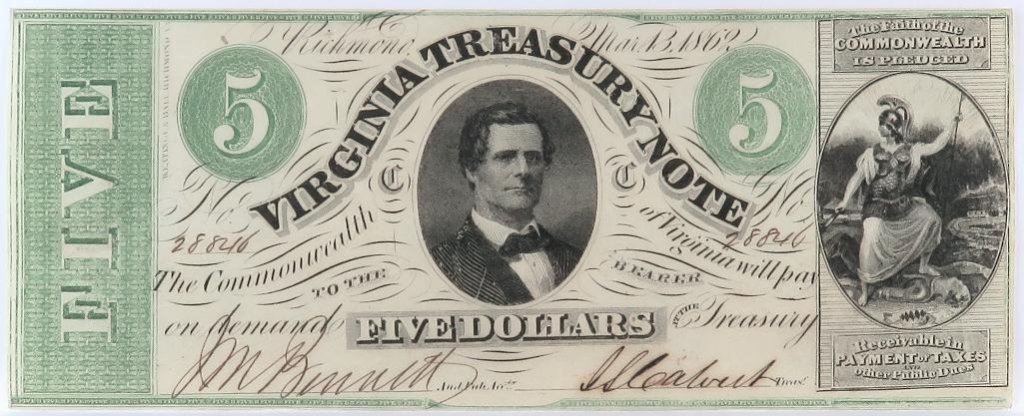 Obsolete Note: 1862 $5 State of Virginia - Treasury Note - CR13.