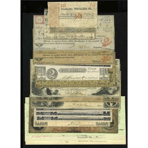 <B>Obsolete Obsession.</B></I><BR><B>Montgomery, AL- Alabama Insurance Co.</B></I> 10¢ Jan. 1862 Rosene 228-2 <B>VG-Fine</B></I><BR><B>Augusta, GA- Augusta Insurance & Banking Co.</B></I> 75¢ Jan. 1, 1863 G88 <B>AU</B></I><BR><B>Savannah, GA- Merchants & Planters Bank</B></I> 50¢ Mar. 1, 1863 G58b <B>VG</B></I><BR><B>Springfield, IL- Franklin Life Insurance Co.</B></I> $1, $5, $10 May 15, 1933 Shafer IL320-1, 5, 10 <B>AU+,</B></I> roulette cancelled<BR><B>Raleigh, NC- State of North Carolina</B></I> $2 Oct. 4, 1861 Cr. 21 <B>CU</B></I><BR><B>Greensboro, NC- Greensboro' Mutual</B></I> 25¢, 25¢, 25¢ 1861-62 <B>Fine, backed; VG; AU</B></I><BR><B>Greensboro, NC- Greensboro' Mutual</B></I> 50¢, $1, $2, $2 Dec. 7, 1862 <B>VG</B></I> or better<BR><B>Guilford County, NC- Revenue Anticipation Note</B></I> 25¢, 50¢, $1, $5 Apr. 14, 1933 <B>VG</B></I> or better, roulette cancelled<BR><B>Nashville, TN- Bank of Tennessee</B></I> 50¢ Dec. 1, 1861 G62b <B>VG</B></I><BR><B>Richmond, VA- Bank of the Commonwealth</B></I> $20 Sep. 4, 1858 G4a <B>VG,</B></I> backed.