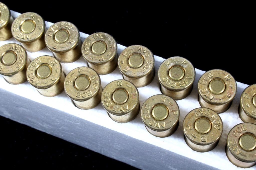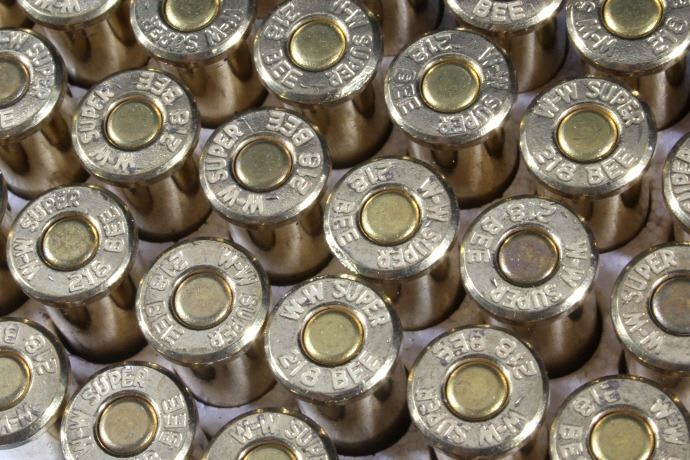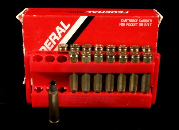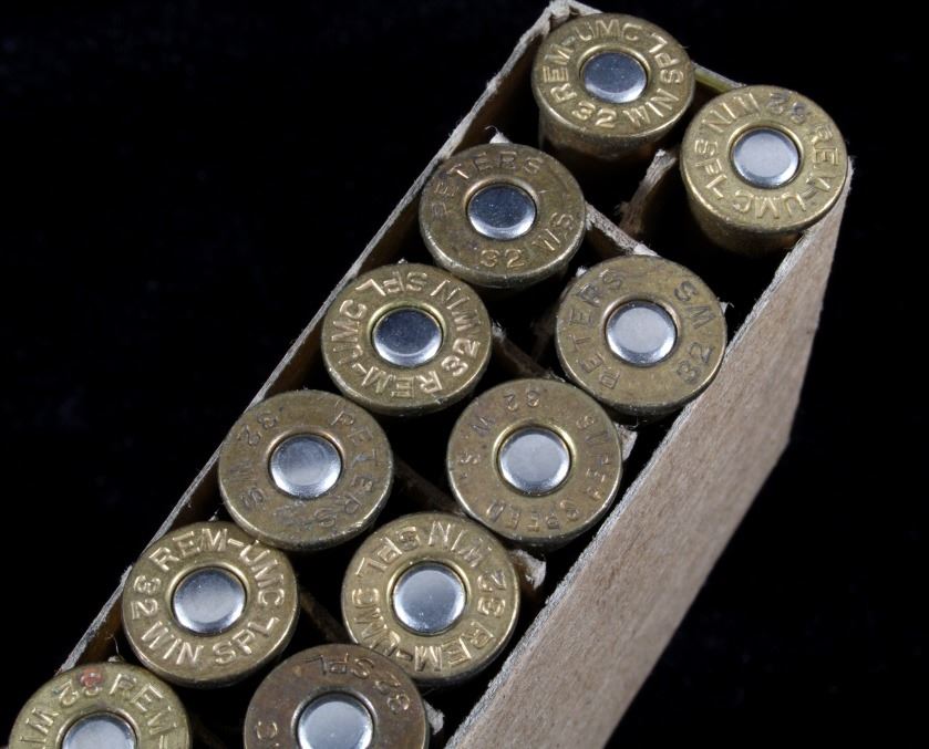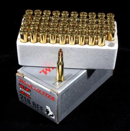 Provided for bidding in this lot is a collection of obsolete and semi-obsolete ammunition: One full factory loaded box of 50 .218 Bee cartridges, Winchester manufacture, 46 grain hollow point bullet; One twenty round box of misc. loaded 7mm Mauser (7X57) cartridges, and one box containing 16 misc. primed but not loaded 7mm Mauser cases; One box of rare, discontinued Remington factory loaded .303 Savage ammunition with 180 grain Core-Lokt soft point bullets; One John Wayne commemorative .32-40 caliber box containing 18 rounds of jacketed bullet .32-40 cartridges correctly formed from .32 WS cases; one rare plastic sealed box of twenty Oliver F. Winchester commemorative .38-55 ammo, factory label states 255 grain S.P. bullets. Overall, the collection ranges from very good to new in box condition. The Federal 7mm Mauser box is the largest in the lot, and measures 6" long, 3 1/2" deep, and 1 1/4" thick.