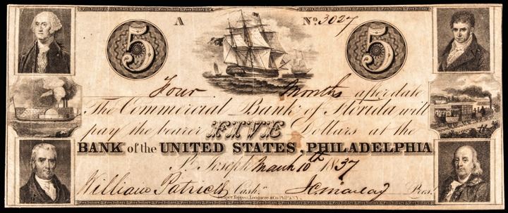 (Second) Bank of the United States & Commercial Bank of Florida, St. Joseph, FL. 1837 Issued Note PCGS VF-30