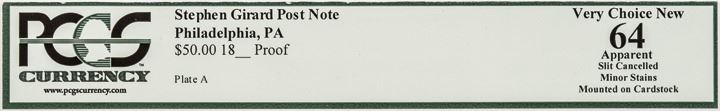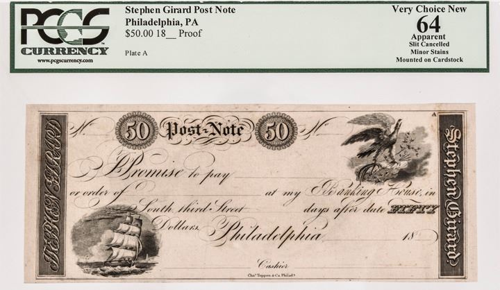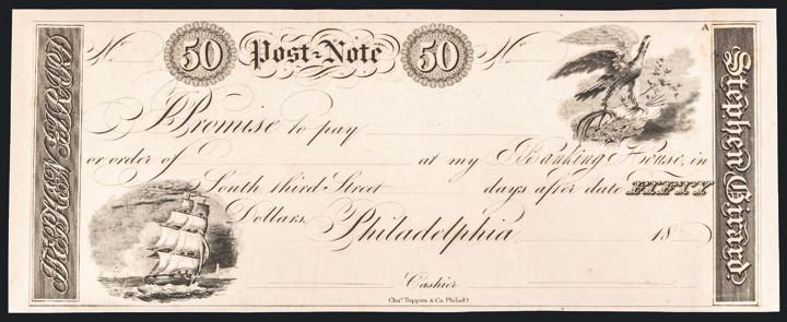 Philadelphia, PA. Stephen Girard’s Banking House. Fifty Dollars. Post Note. Choice India Paper on Card Proof.
