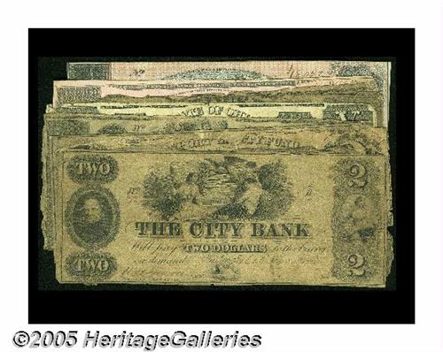 <B>Obsoletes and Confederates</B></I><BR>Washington, DC- City Bank $2 June 10, 1852 G$ VG<BR>Unknown, IN- Bank of Indiana $3 Feb. 1, 1851 Haxby Design 3A Fair<BR>Newport, KY- Bank of Kentucky Feb. 2, 185? G4 Poor<BR>Portland, ME- Casco Bank $5 ?,1853 C48a Good<BR>St. Clair, MI- Bank of St. Clair $5 G56 VG<BR>Massillon, OH- Bank of Massillon $5 July 1, 1853 G8a Fine<BR>Sandusky, OH- Bank of Sandusky $1 ?, 18?? G2 Wolka 2382-02 Two Examples About Good, Good<BR>Confederate T52 $10 1862 Fine, edge damage<BR>Confederate T69 $20 1864 VF.<BR>