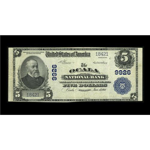 <B>Ocala, FL</B></I> - $5 1902 Plain Back Fr. 601 <B>The Ocala NB</B></I> Ch. # 9926<BR>This is a handsome <B>Very Fine</B></I> with faded signatures that first went up for auction in 1977.<BR><BR><b>Shipping:</b> Coin/Currency (<a target="_blank" href="http://www.heritageauctions.com/common/shipping.php">view shipping information</a>)