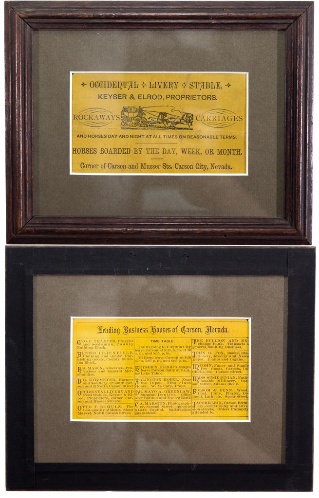 Large trade card with stagecoach, 4.5" x 2.75". The reverse is a directory of 16 of the "Leading Business Houses of Carson, Nevada." Framed in an 8" x 6.5" wooden display. - Jacobitz Collection -59728