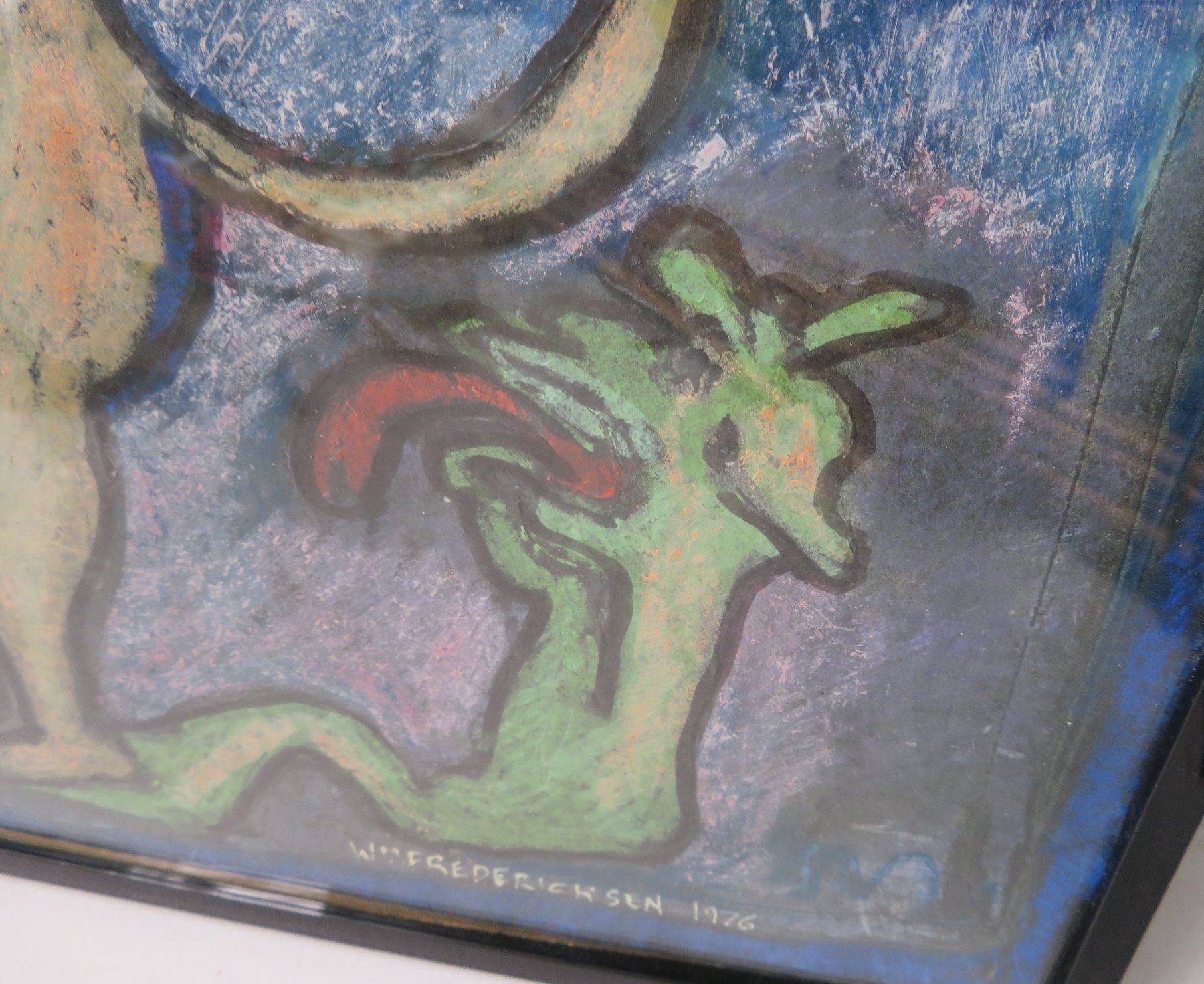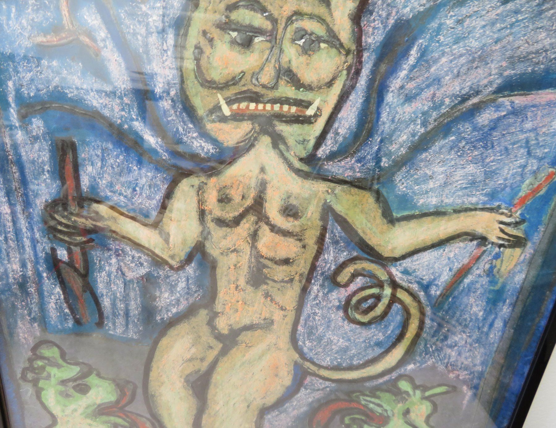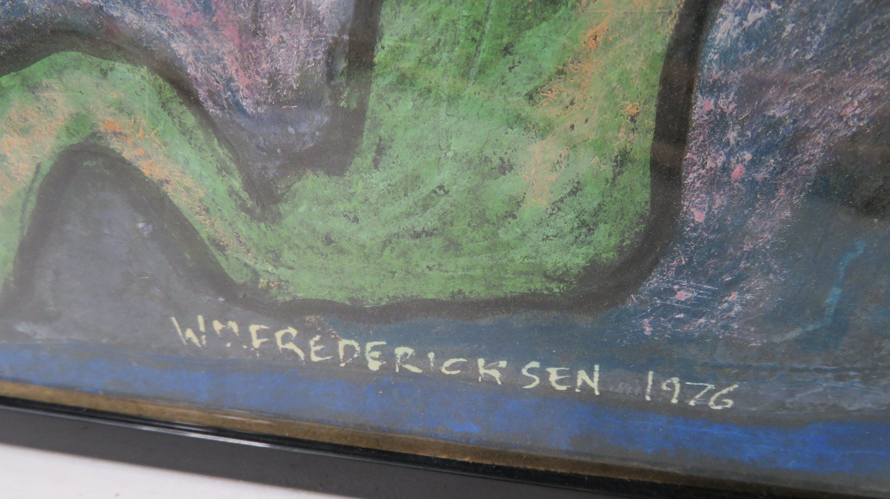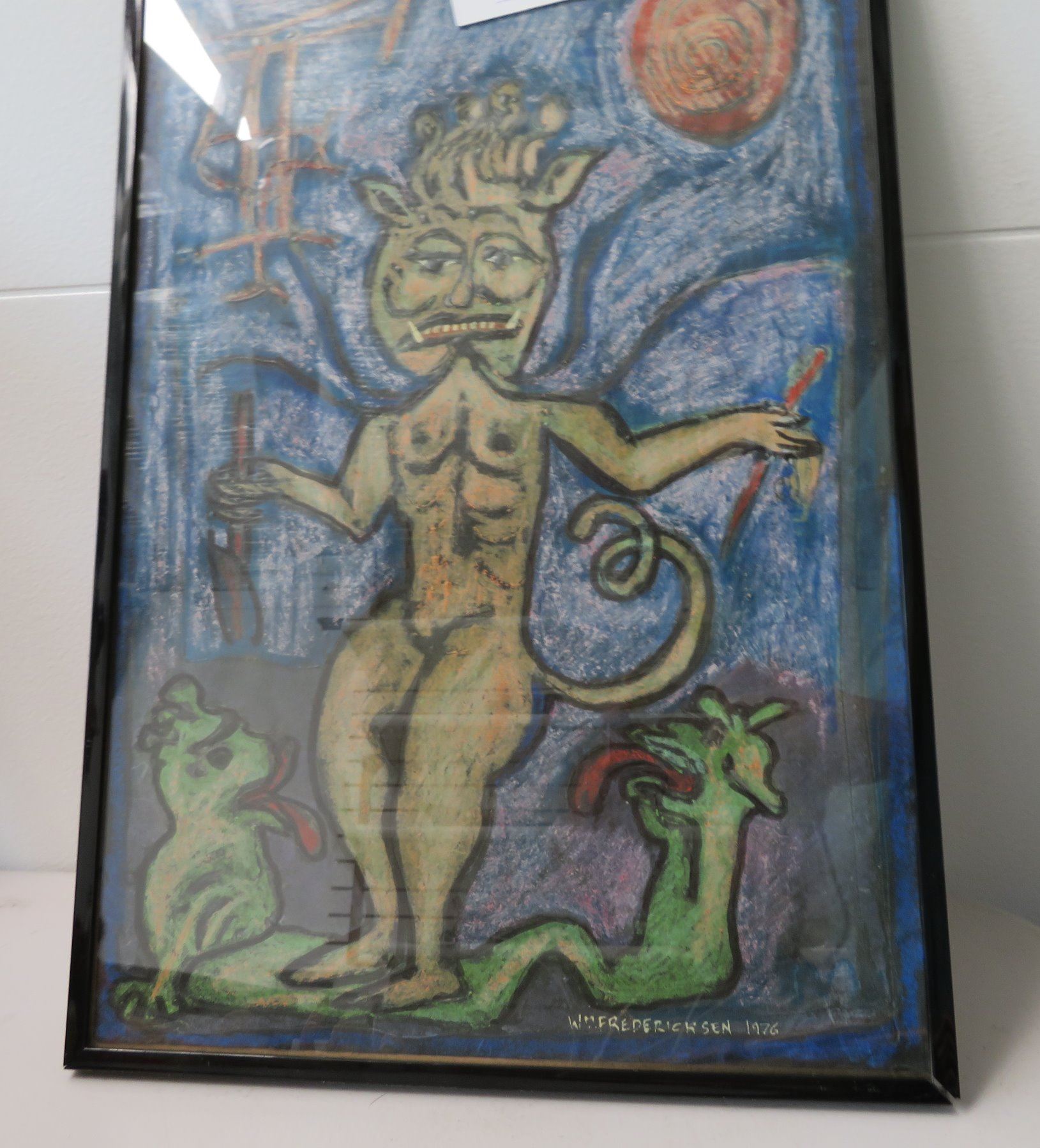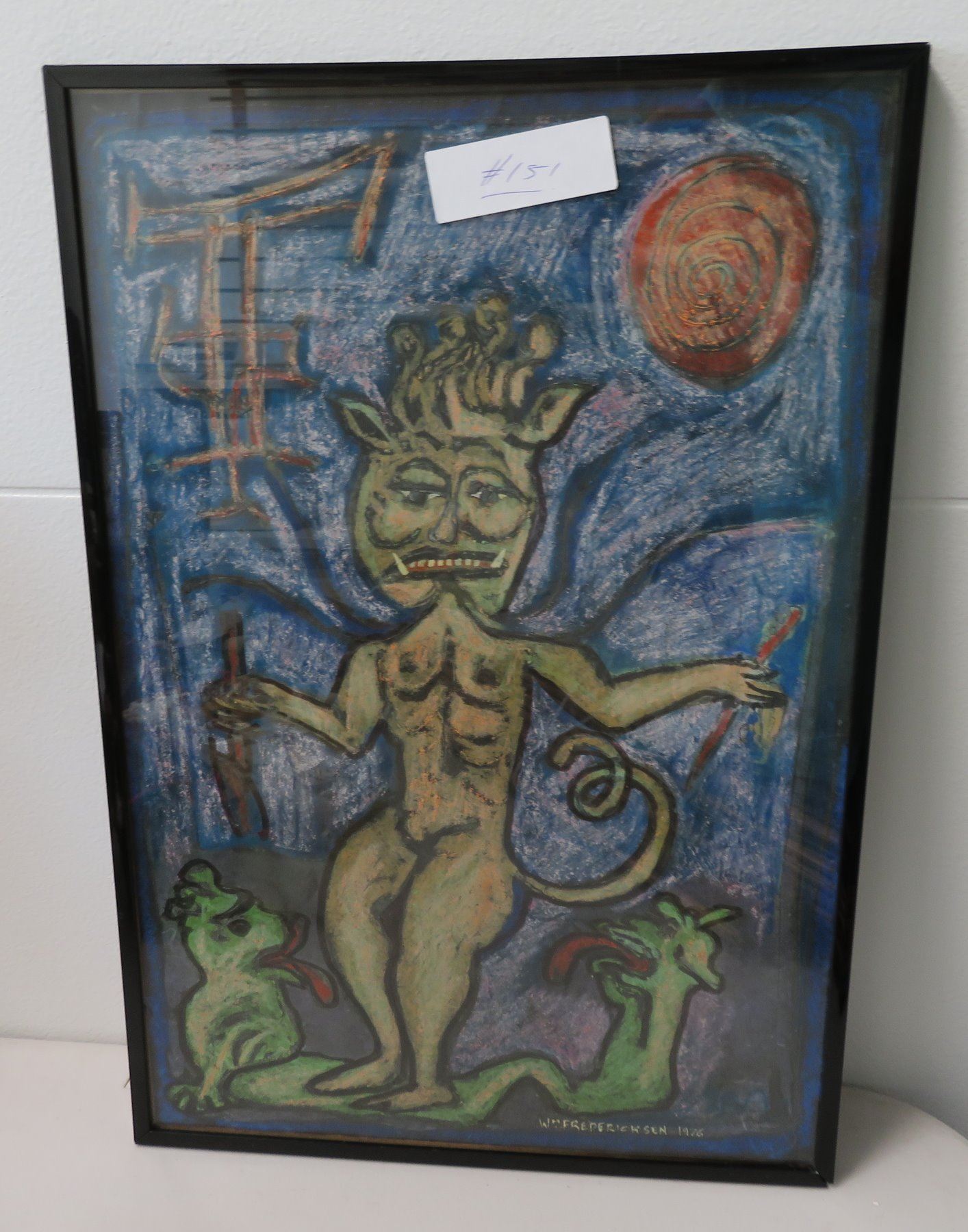 Occult Painting Signed W. Fredericksen, 1976. Made of pastel with metal and glass frame, the item measures 18" x 12" x 1/2". USA, William Fredericksen. Occult-themed painting portraying devilish figure. Condition: Good, see images. Shipping: $40.00 w/insurance and signature, due to size.