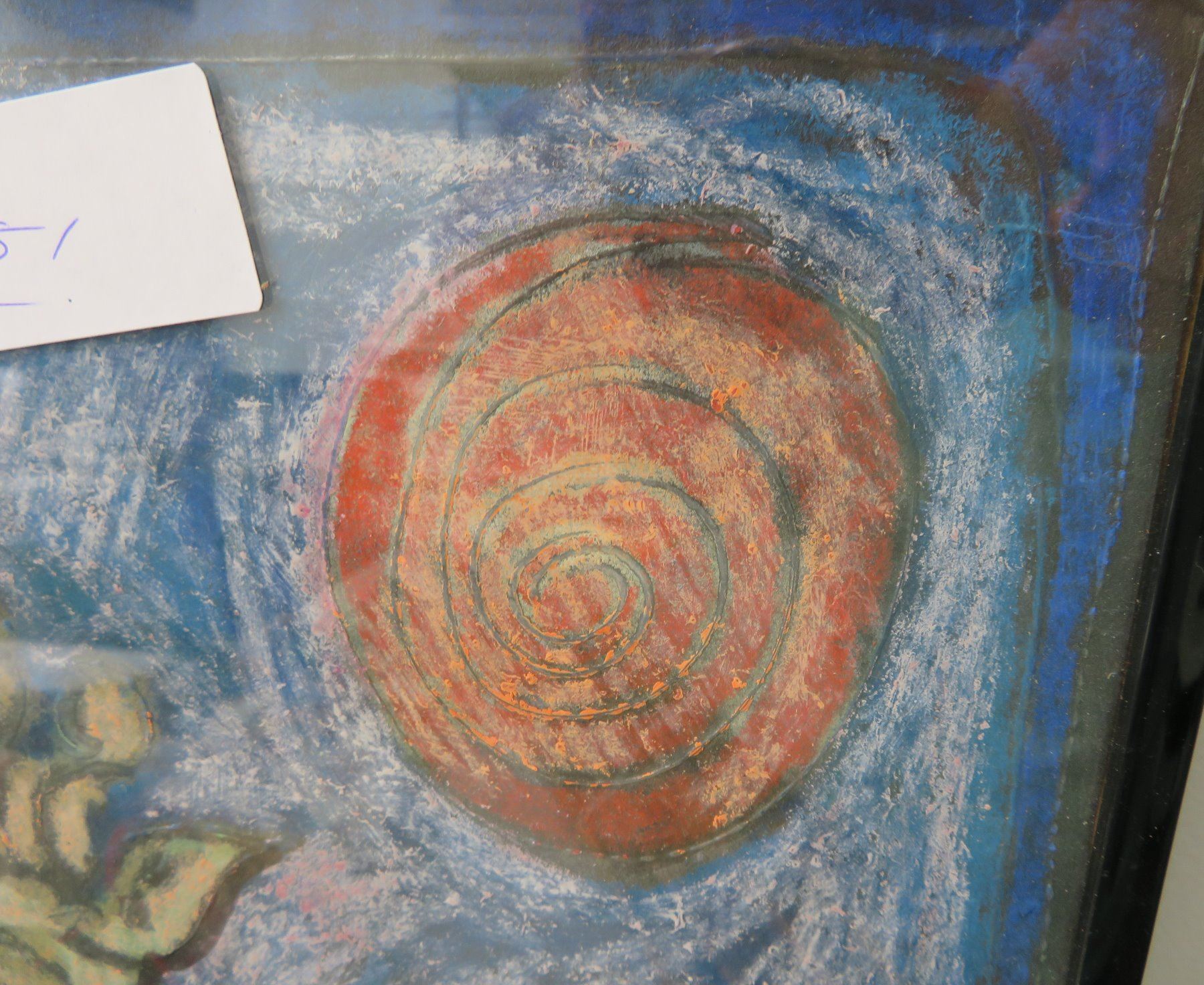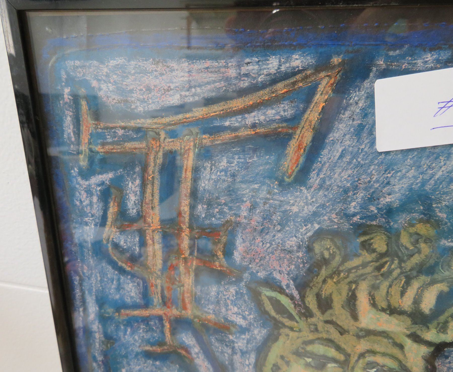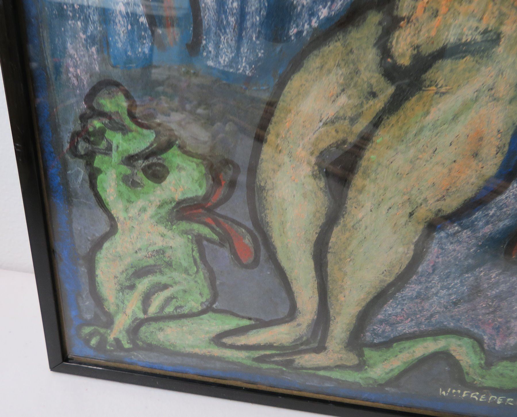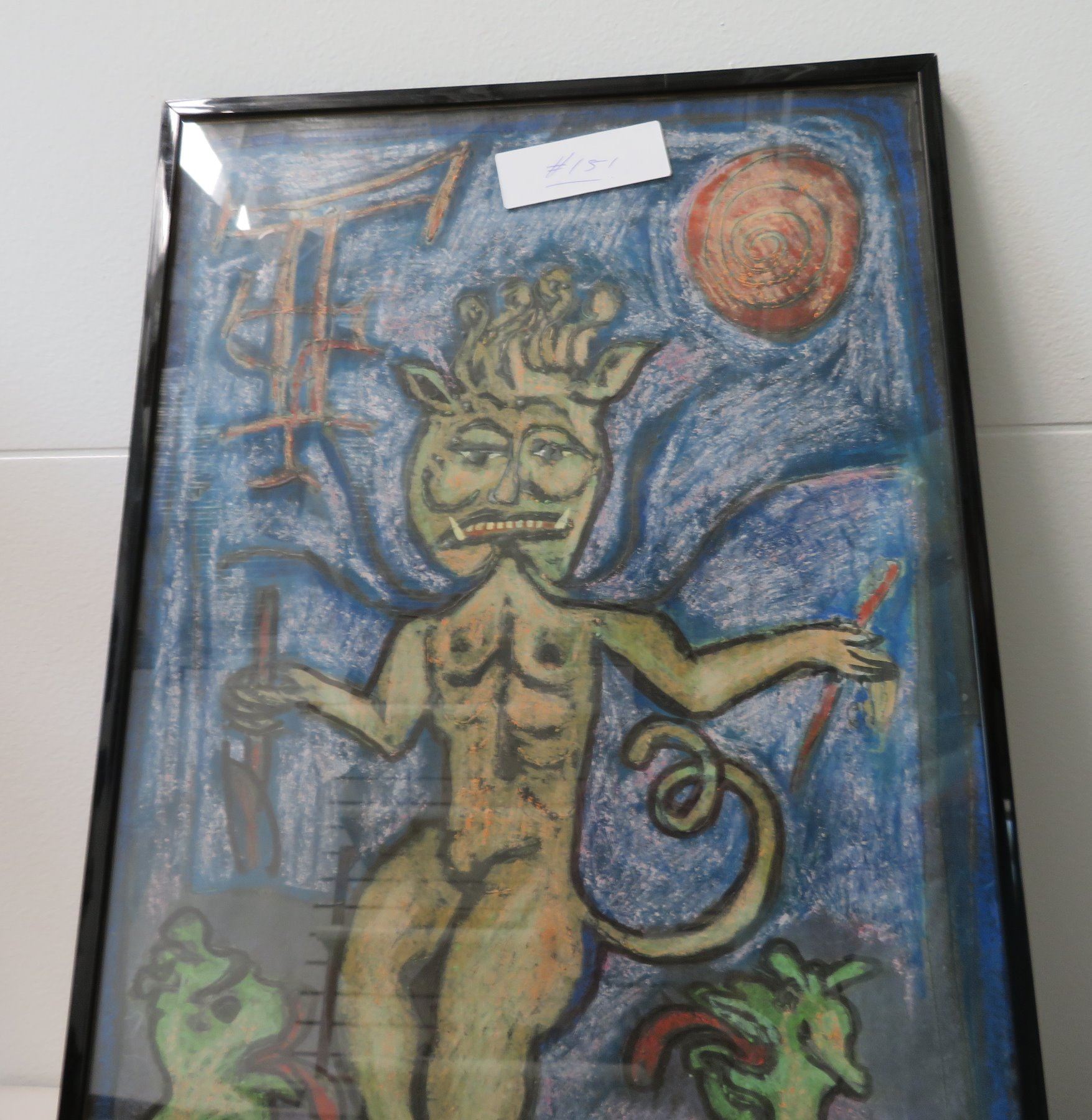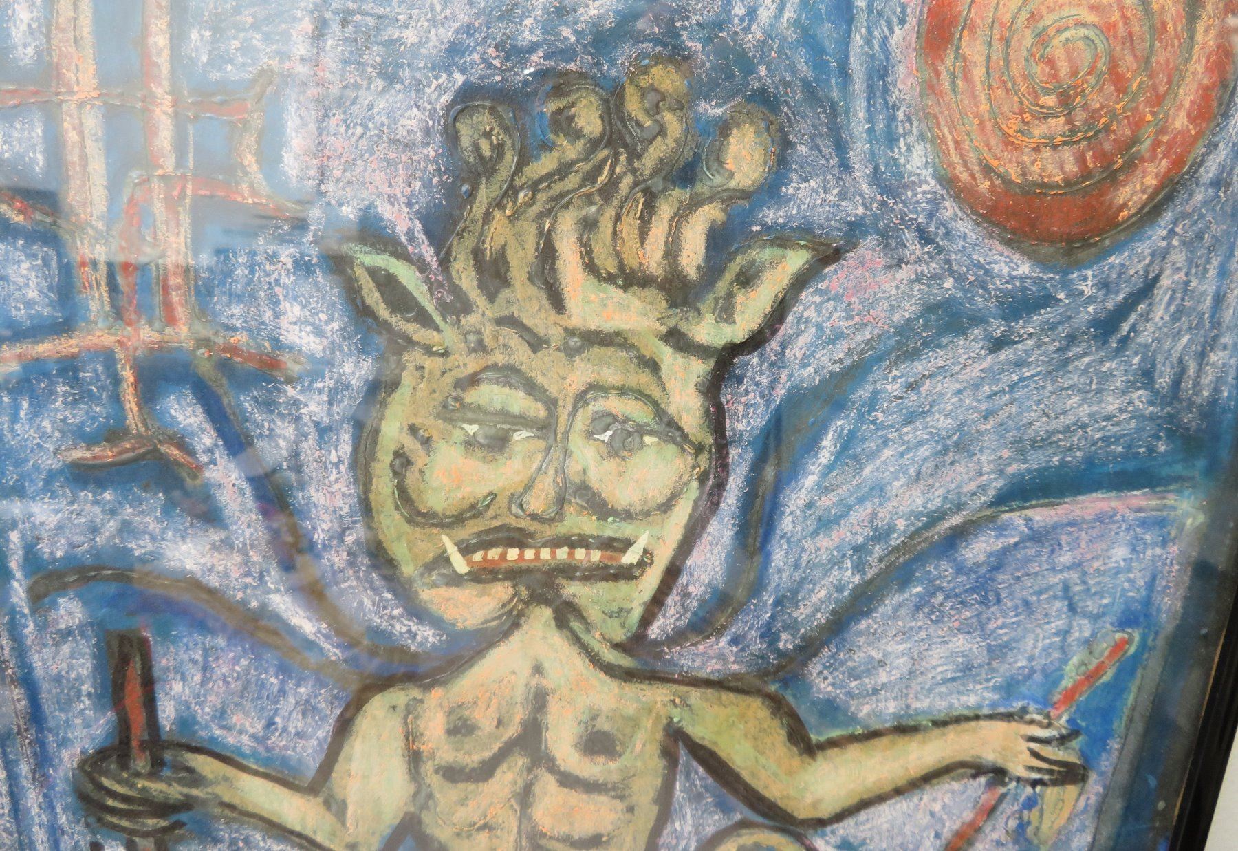 Occult Painting Signed W. Fredericksen, 1976. Made of pastel with metal and glass frame, the item measures 18" x 12" x 1/2". USA, William Fredericksen. Occult-themed painting portraying devilish figure. Condition: Good, see images. Shipping: $40.00 w/insurance and signature, due to size.