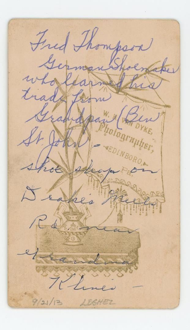 Identified as Fred Thompson whos shop was on Drake's Mills Road. W.H. Van Dyke Photographer, Edinboro Pennsylvania.
