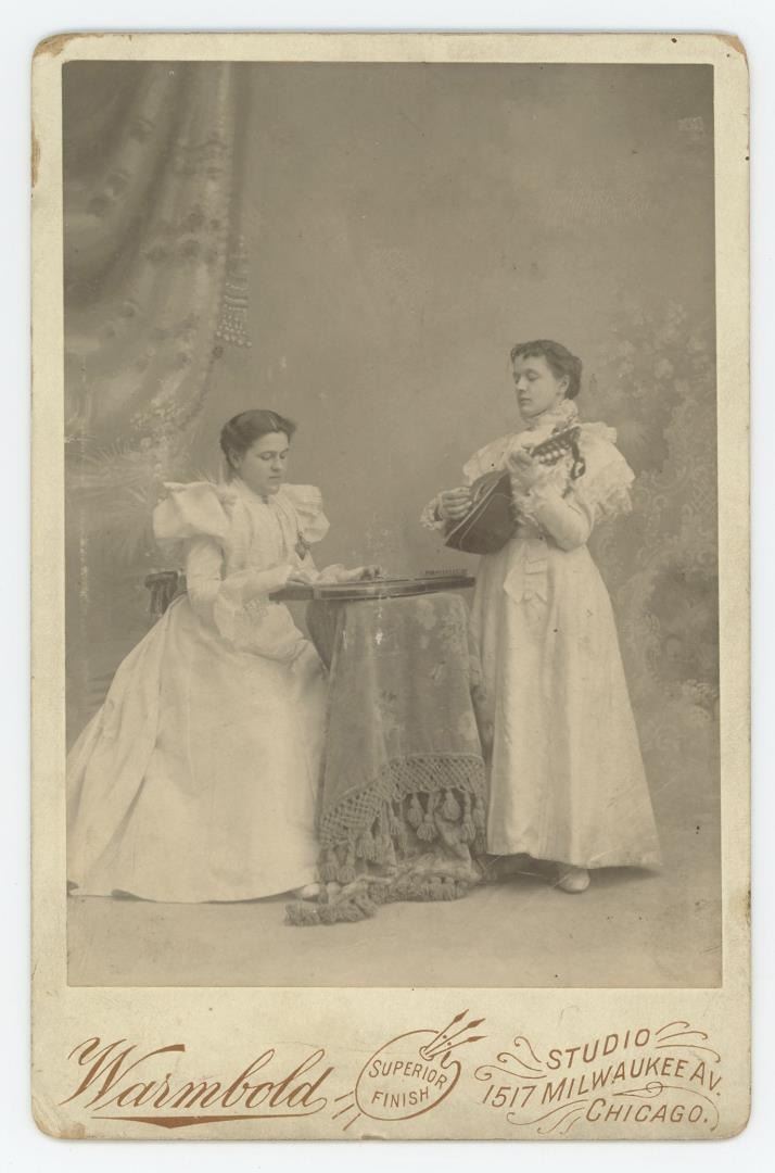 4" by 6 1/2". Photo was taken by Warmbold Studio in Chicago. One woman is shown playing a mandolin and they other is playing a table top zither.