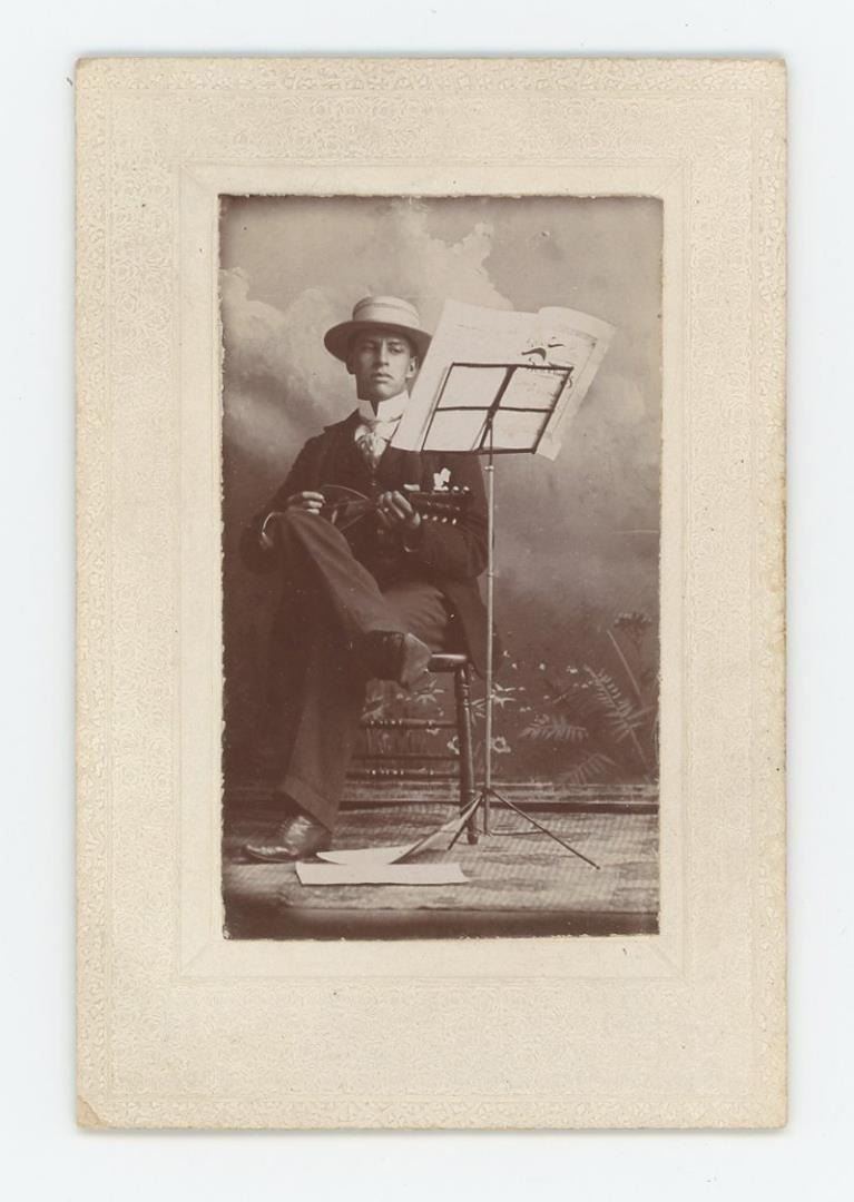 2 1/4" by 3 1/4". Man is pictured playing the mandolin reading sheet music.