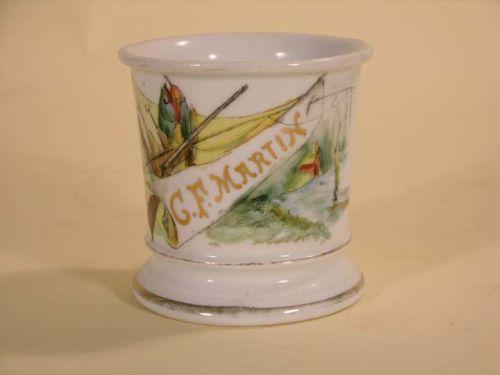 Occupational shaving mug - fisherman/C.F. Martin. Wear to gold trim, no chips or cracks.