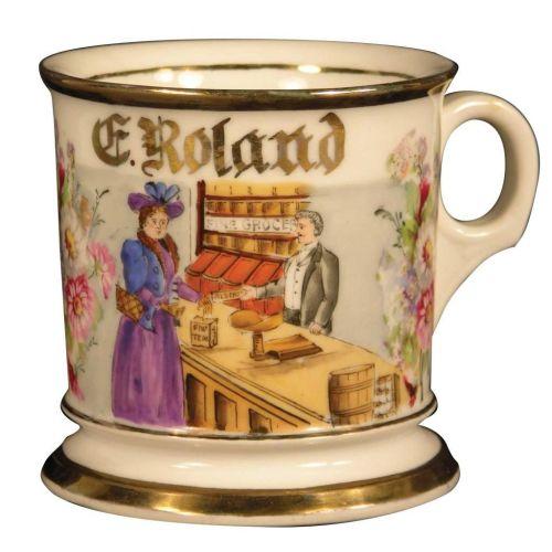 Occupational shaving mug for E. Roland, Grocer. No chips or cracks, excellent condition.